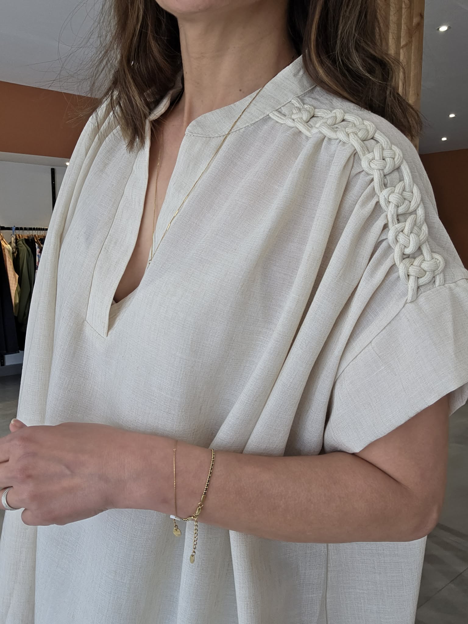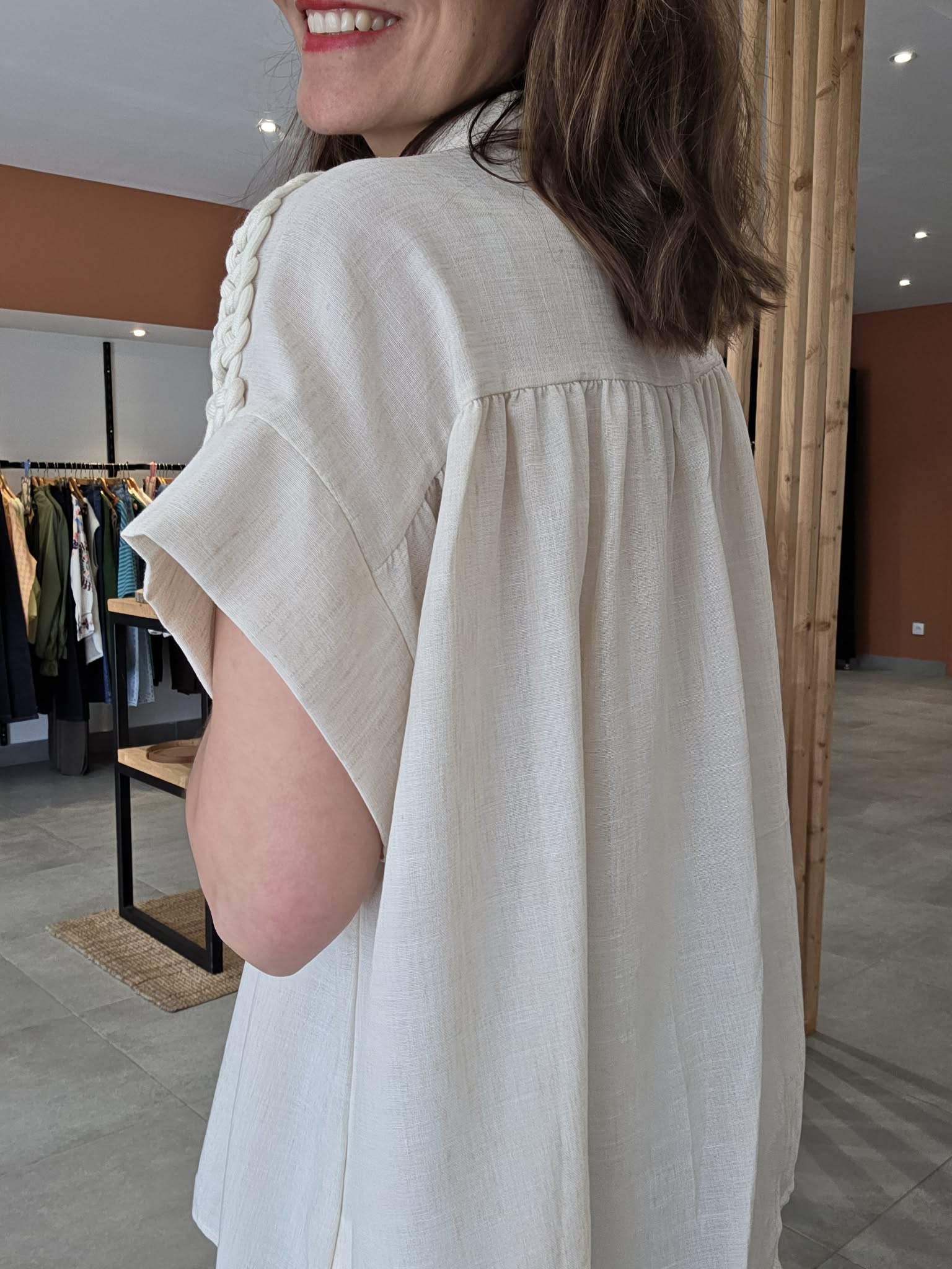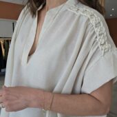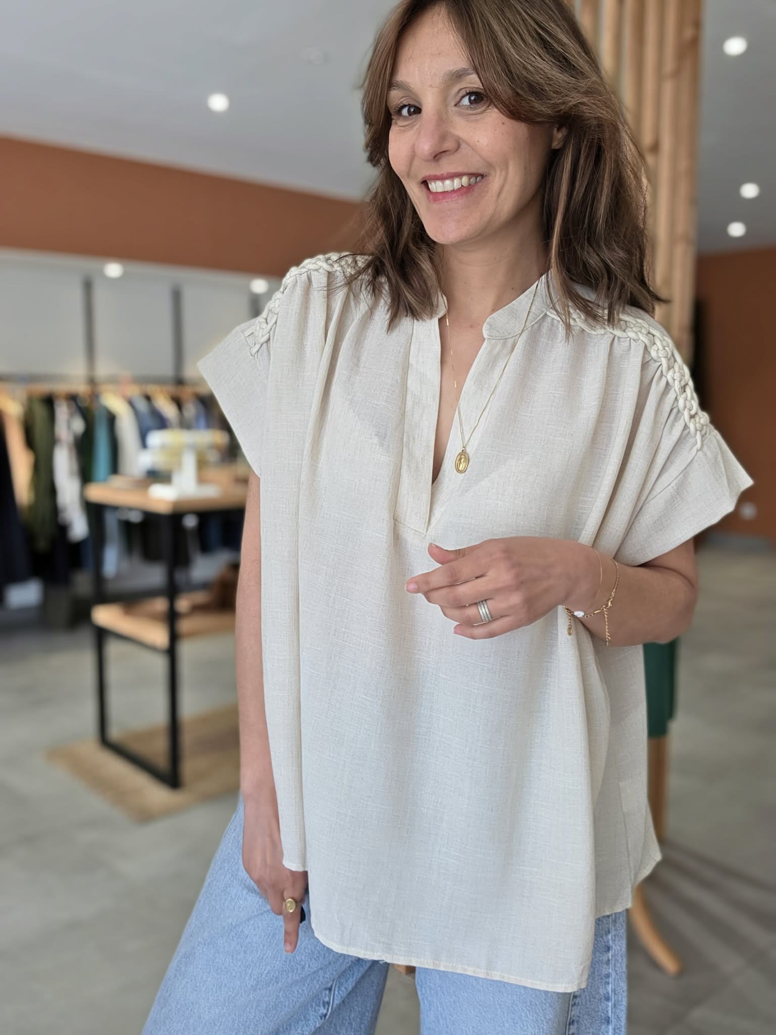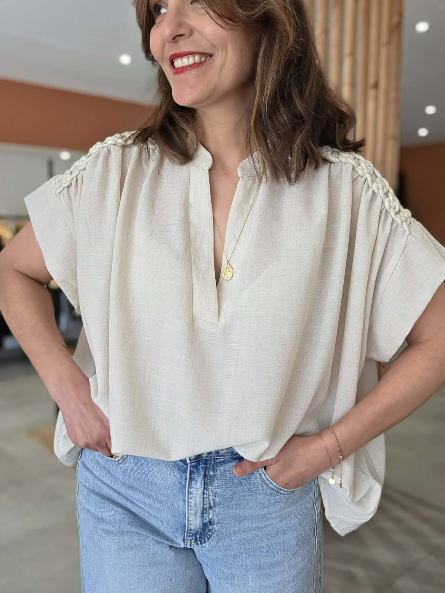 Élégante et facile à porter, cette blouse détail tressé séduit par son style naturel et raffiné. Sa coupe fluide, son encolure en V et ses finitions tressées sur les épaules lui apportent une touche bohème chic très tendance. Légère et agréable à porter, elle s’associe facilement avec un jean, un pantalon fluide ou une jupe pour un look féminin et décontracté.