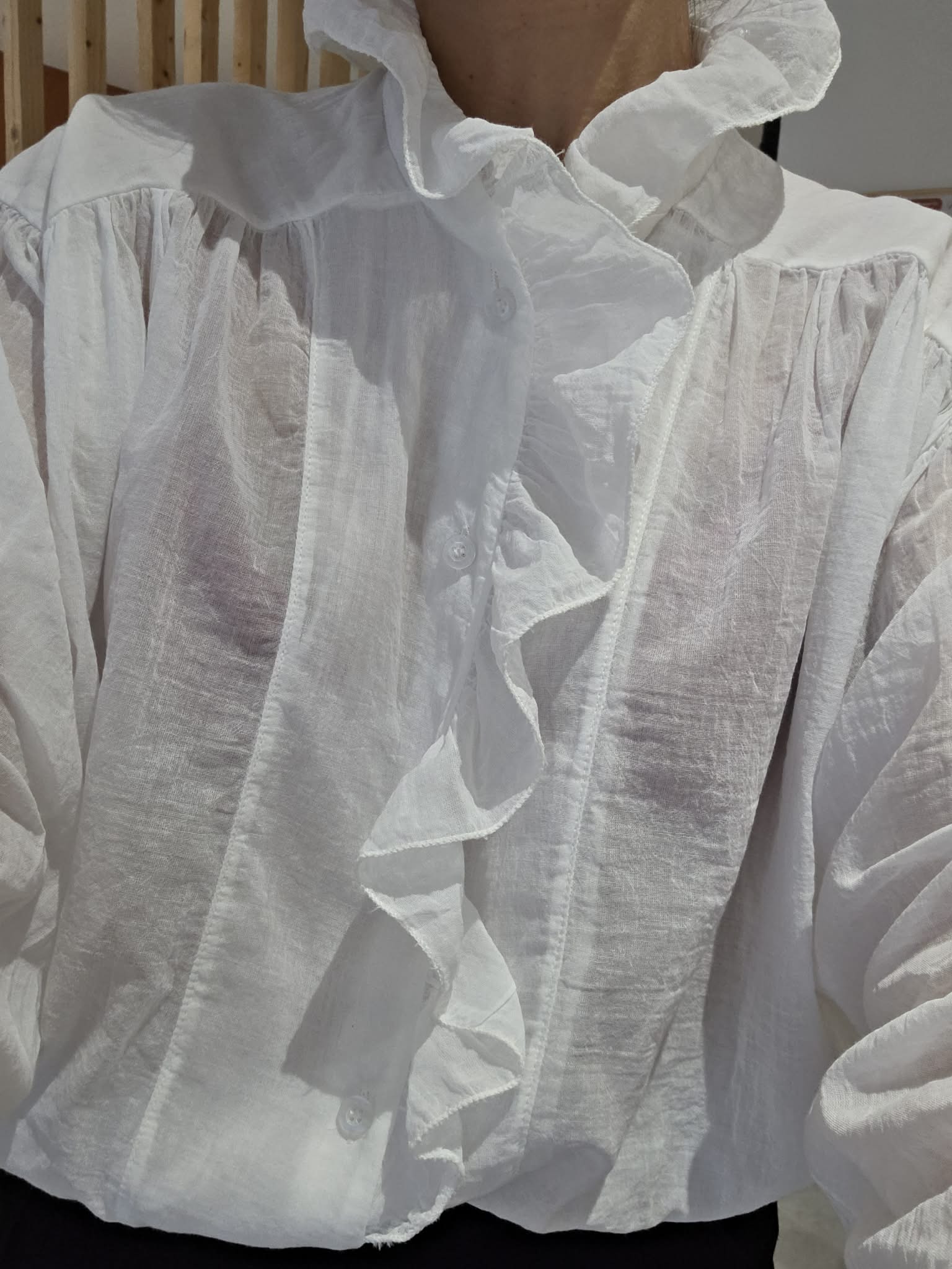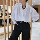 Blouse violine légère au charme romantique, sublimée par un col volanté et une patte de boutonnage délicatement travaillée. Sa matière en coton offre un tombé fluide et agréable, parfait pour la mi-saison.