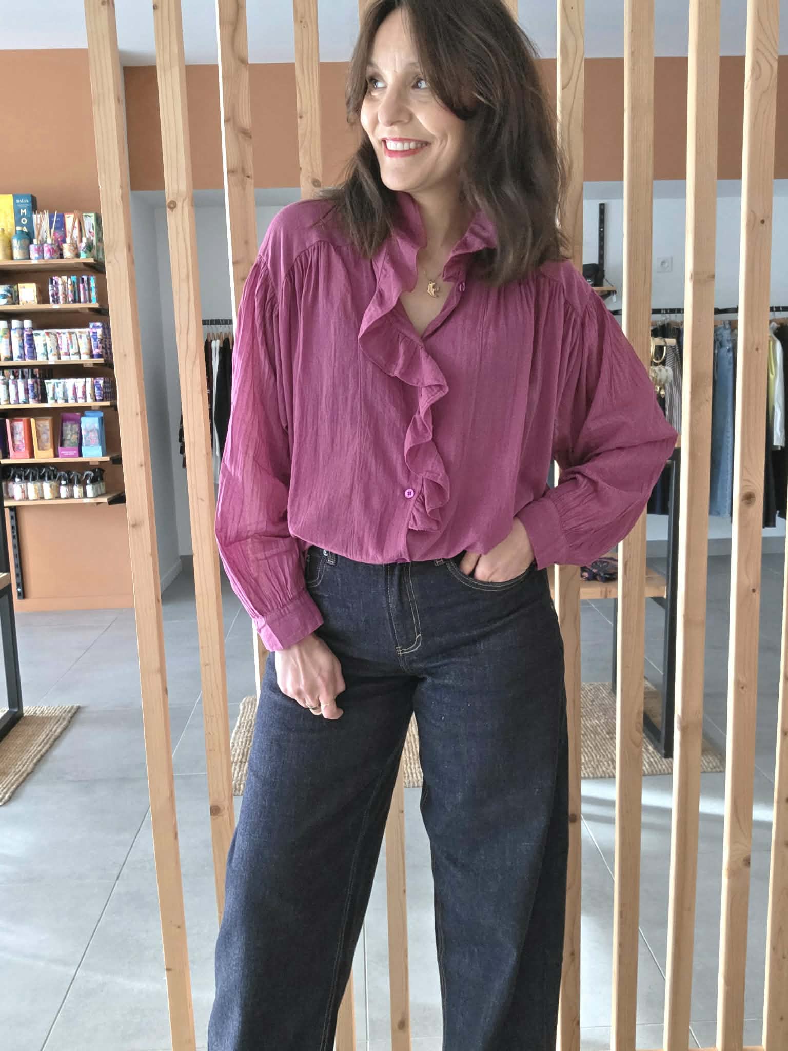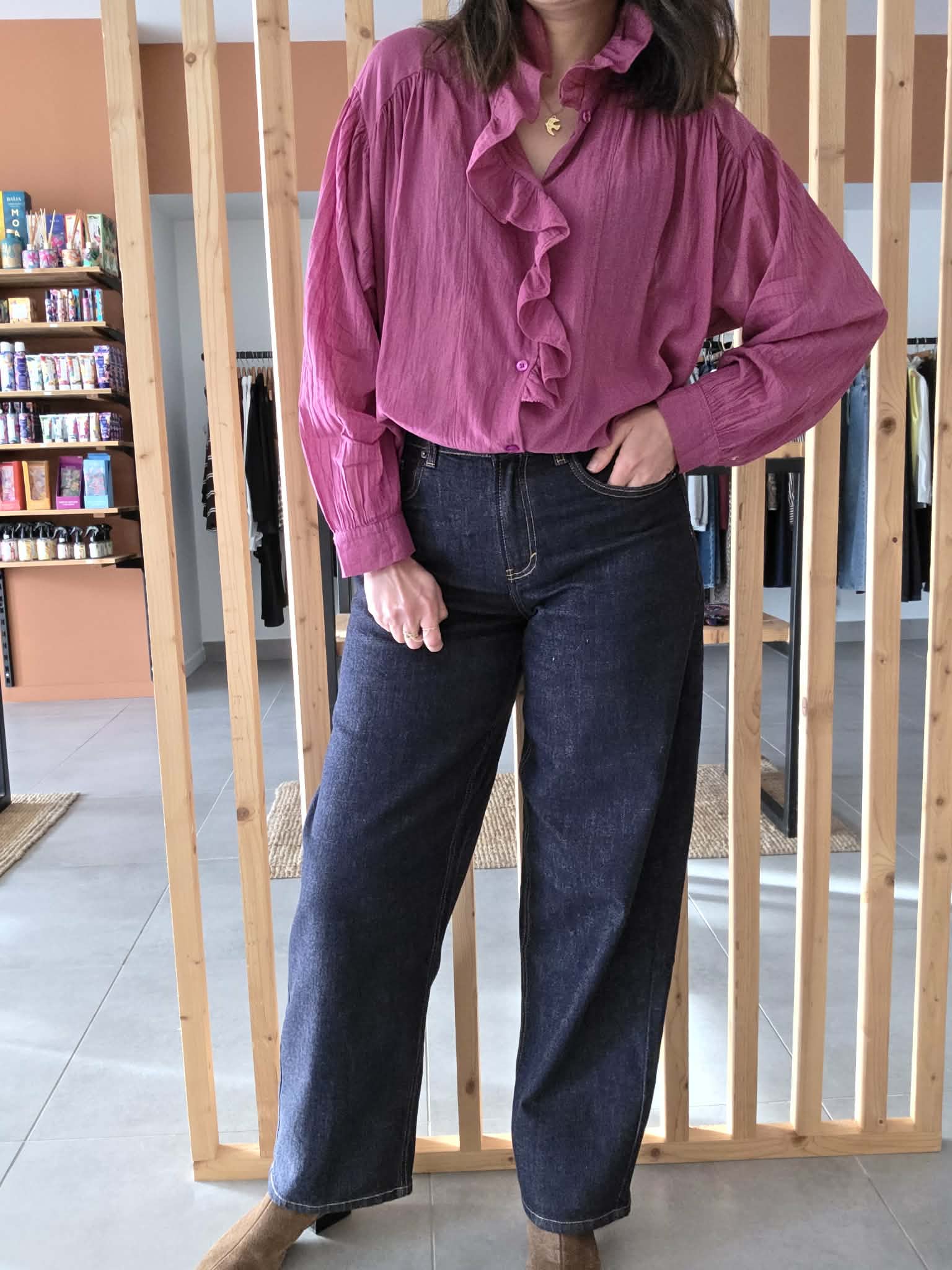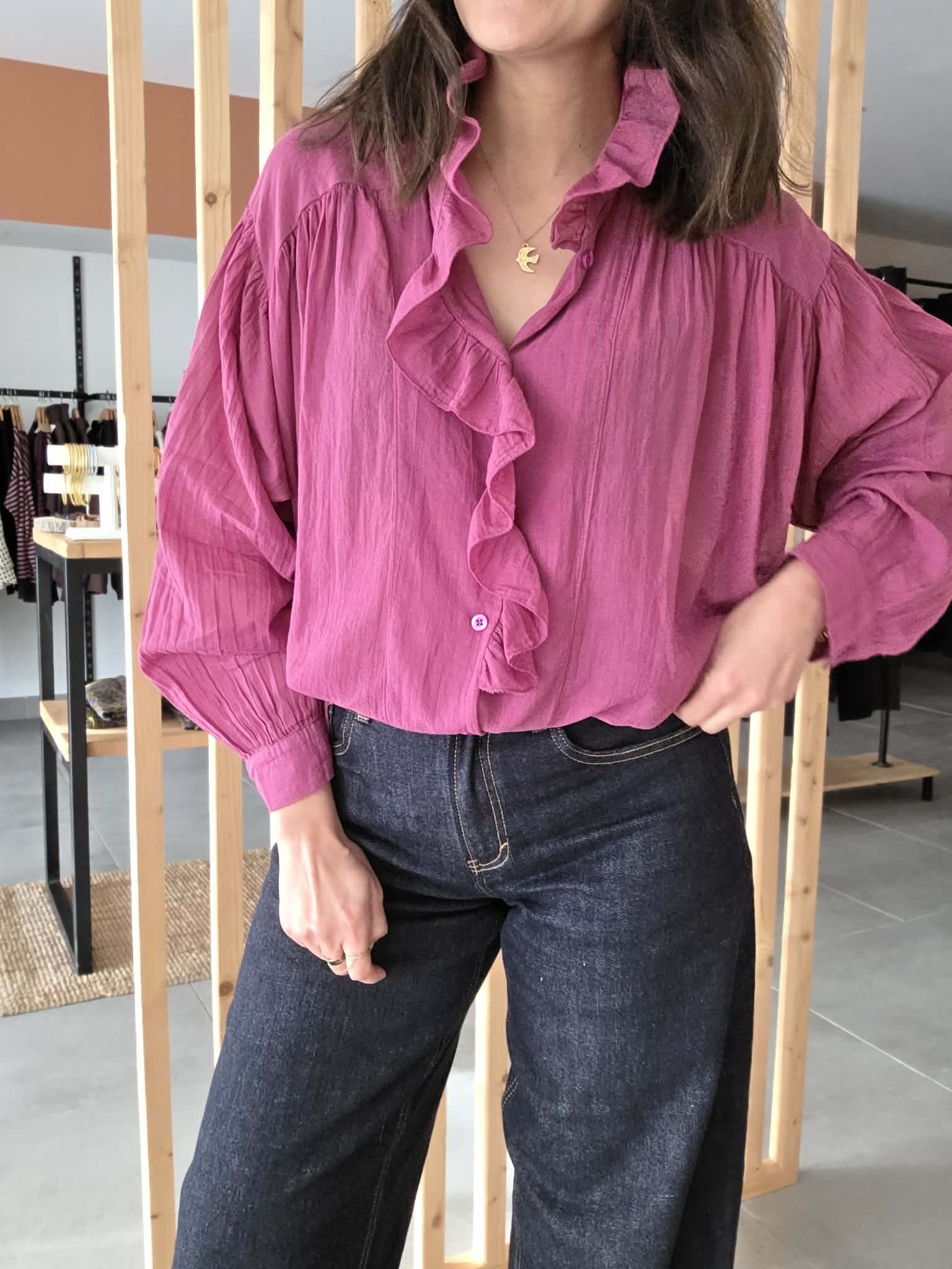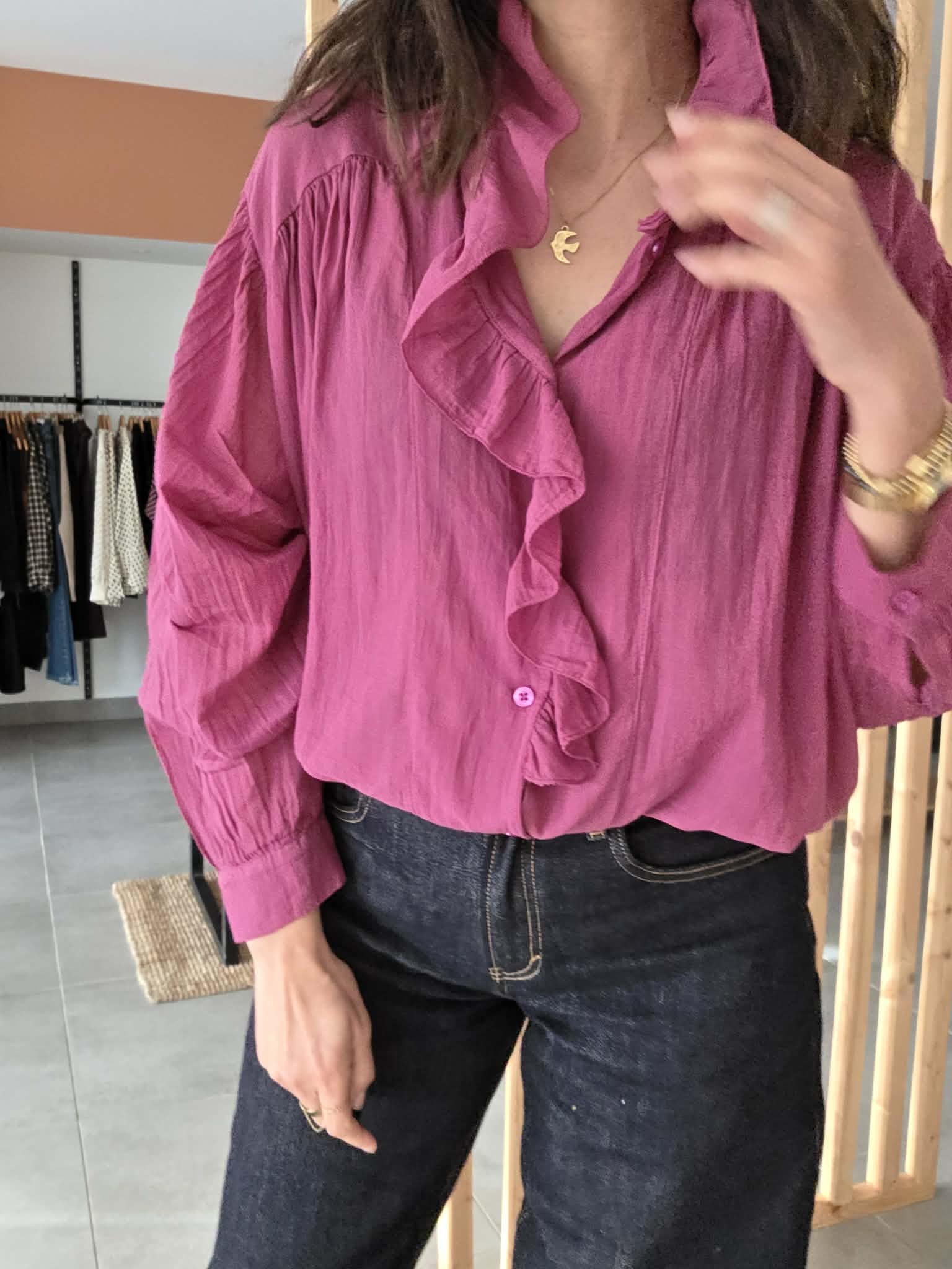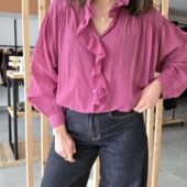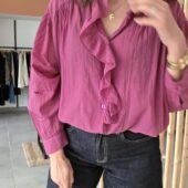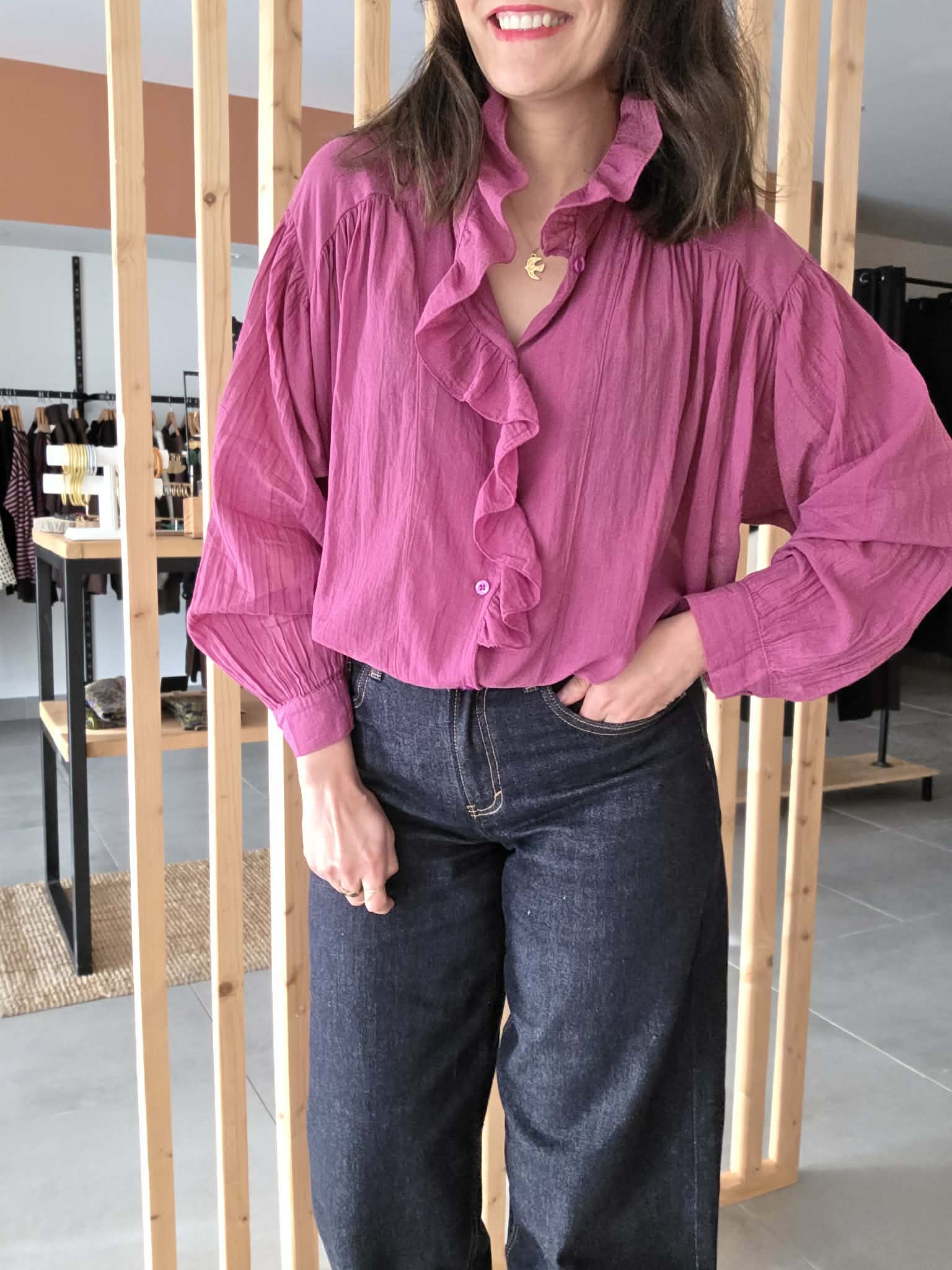 Blouse rose légère au charme romantique, sublimée par un col volanté et une patte de boutonnage délicatement travaillée. Sa matière en coton offre un tombé fluide et agréable, parfait pour la mi-saison comme pour l’été.