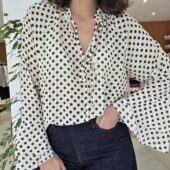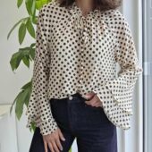 Description : Blouse à poids noire et blanche, avec des manches longues et un col V complété d’un cordon qui peut se nouer.