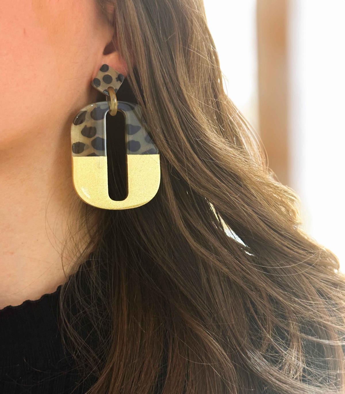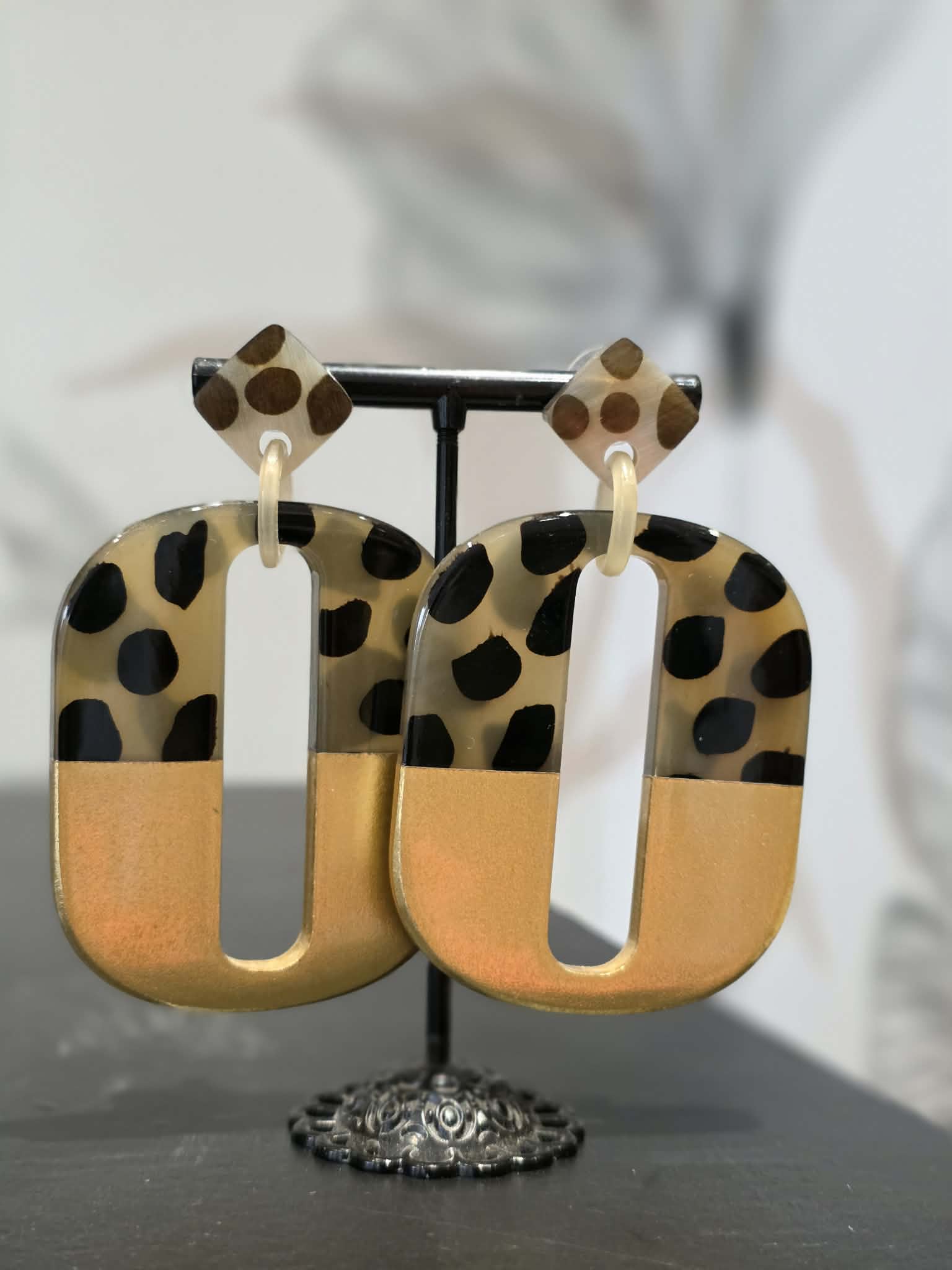 Boucles d’oreilles en corne véritable, modèle ovale et motif léopard et feuilles d’or.