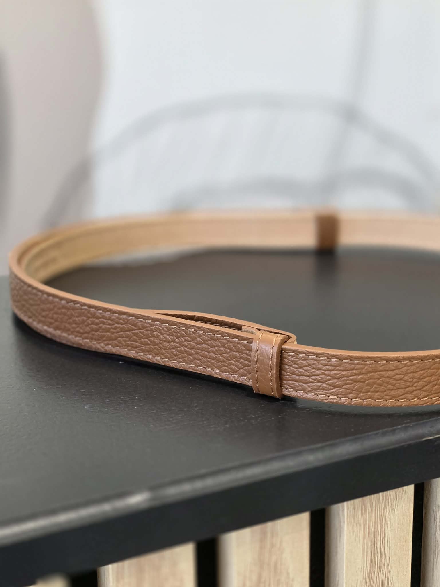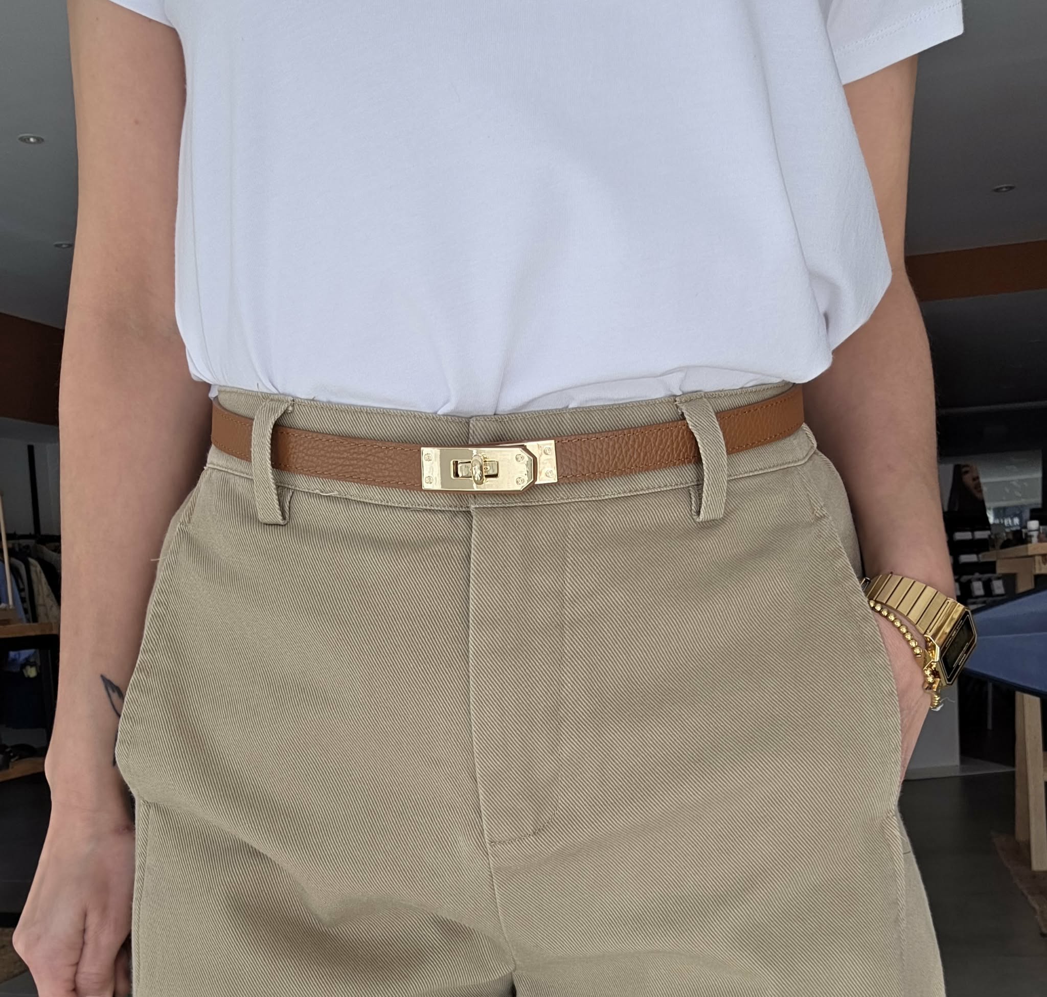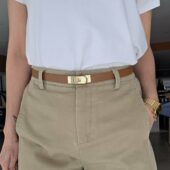 Cette ceinture fine camel sublime instantanément une tenue avec sa boucle dorée élégante et moderne.