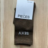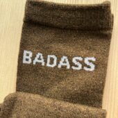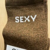 Chaussettes marron pailletées avec le mot sexy en blanc sur l’une des deux chaussettes et sur l’autre chaussette, le mot badass en blanc également.