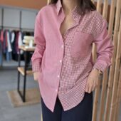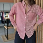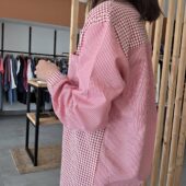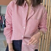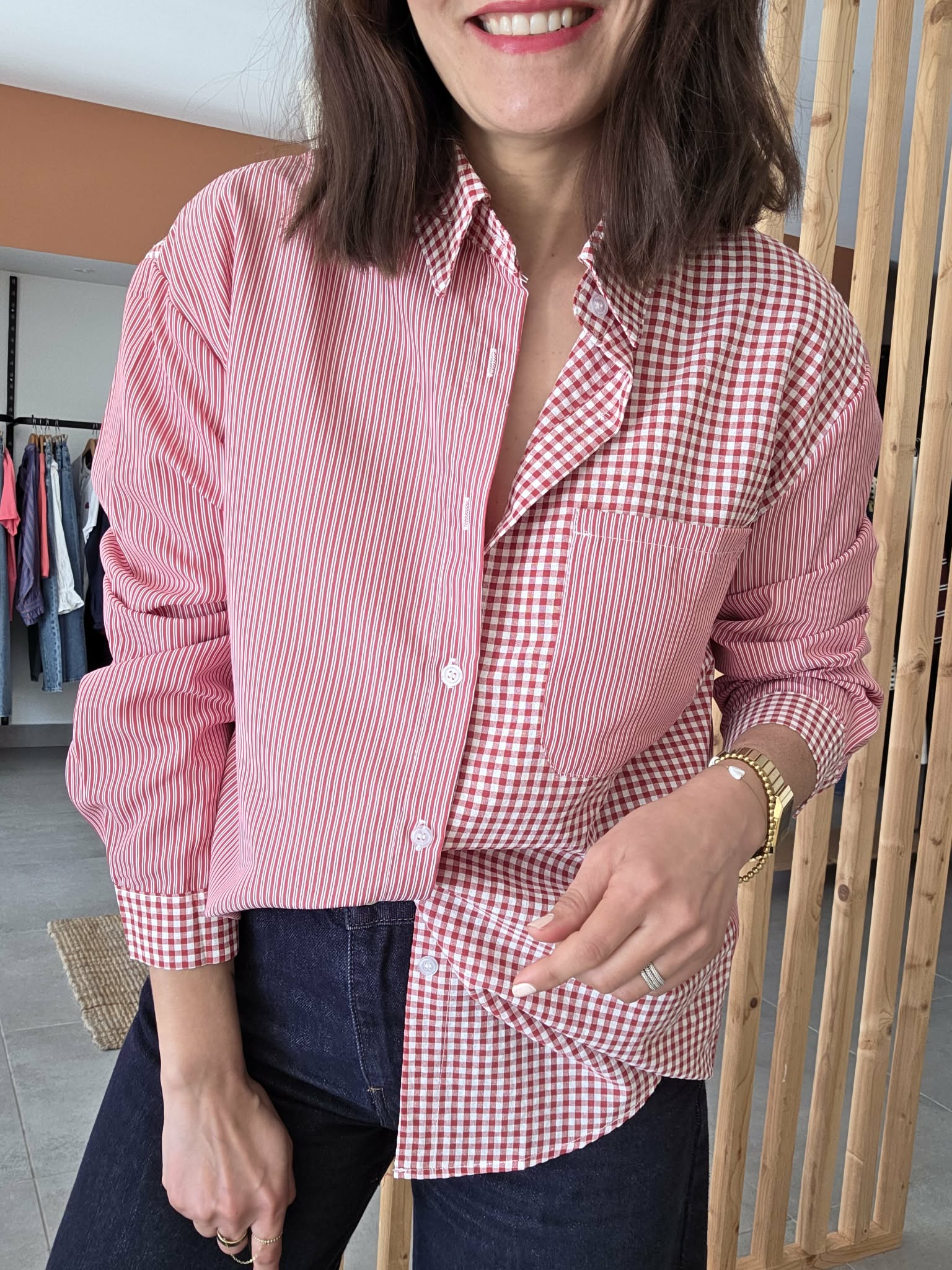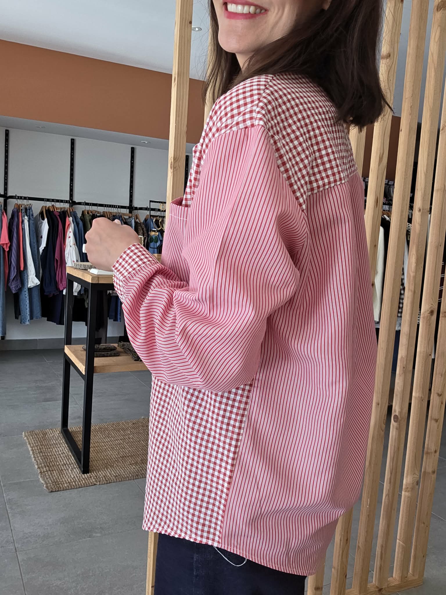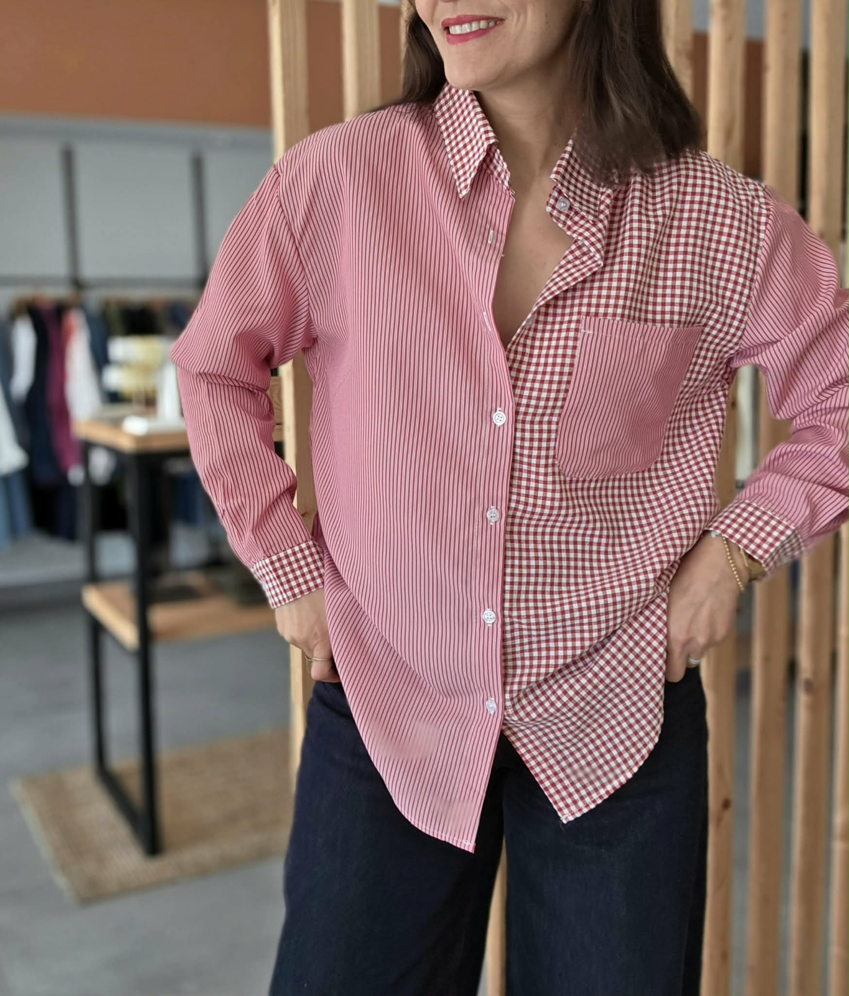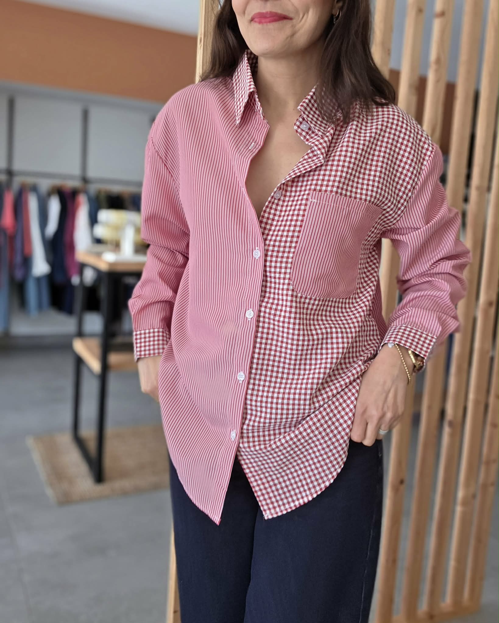 Chemise à manches longues confectionnée dans un tissu à motifs mêlant carreaux et rayures.