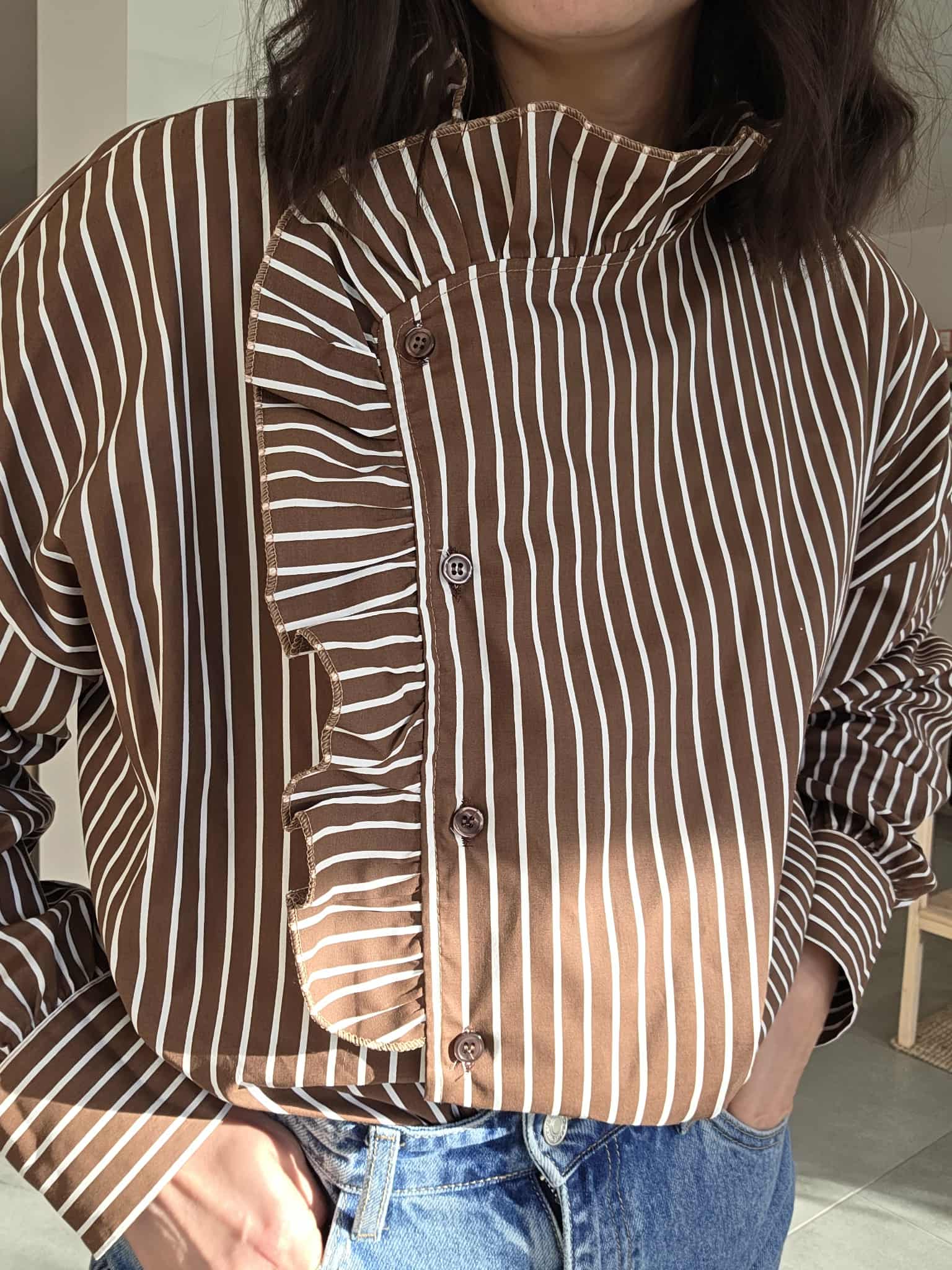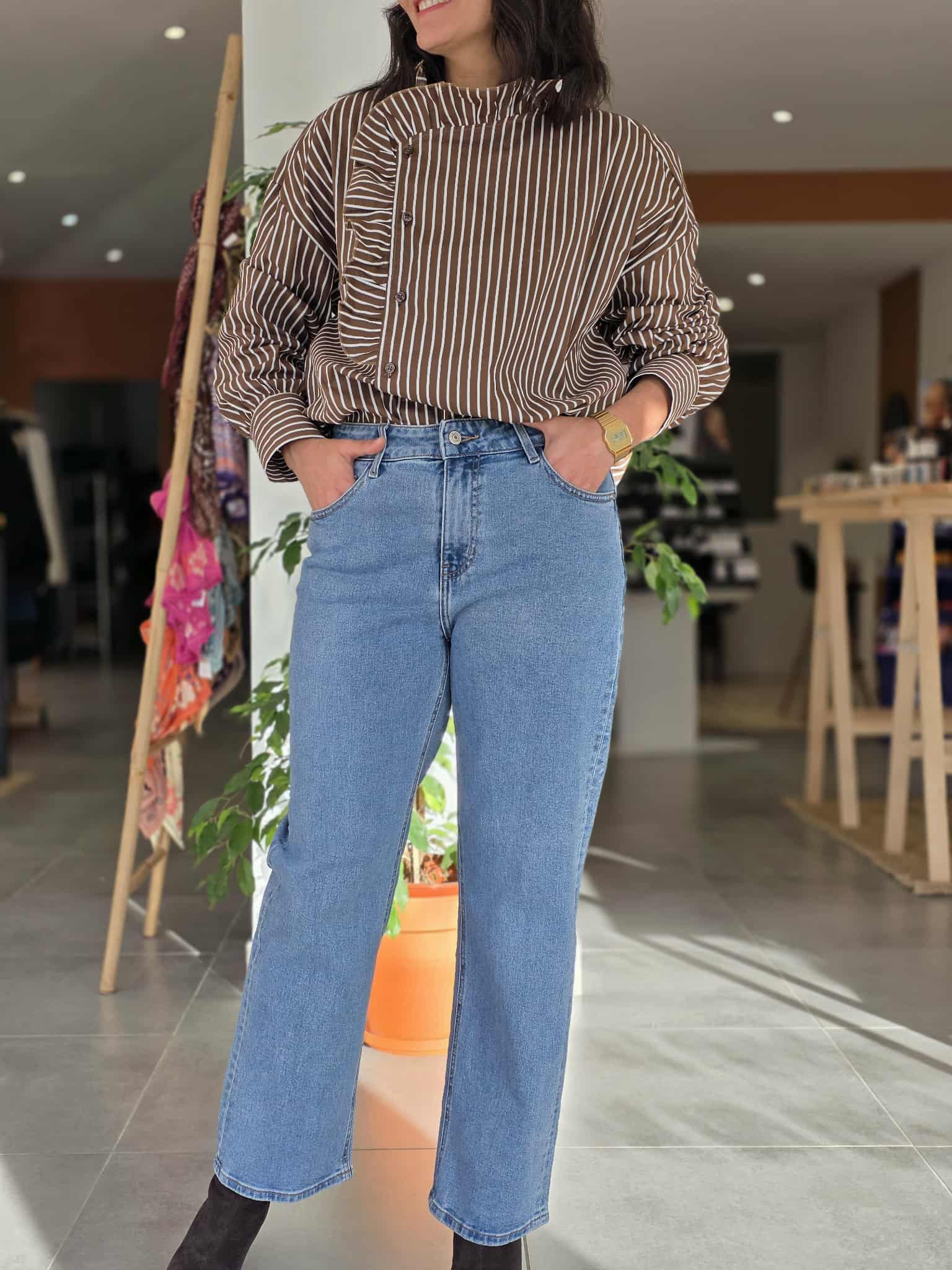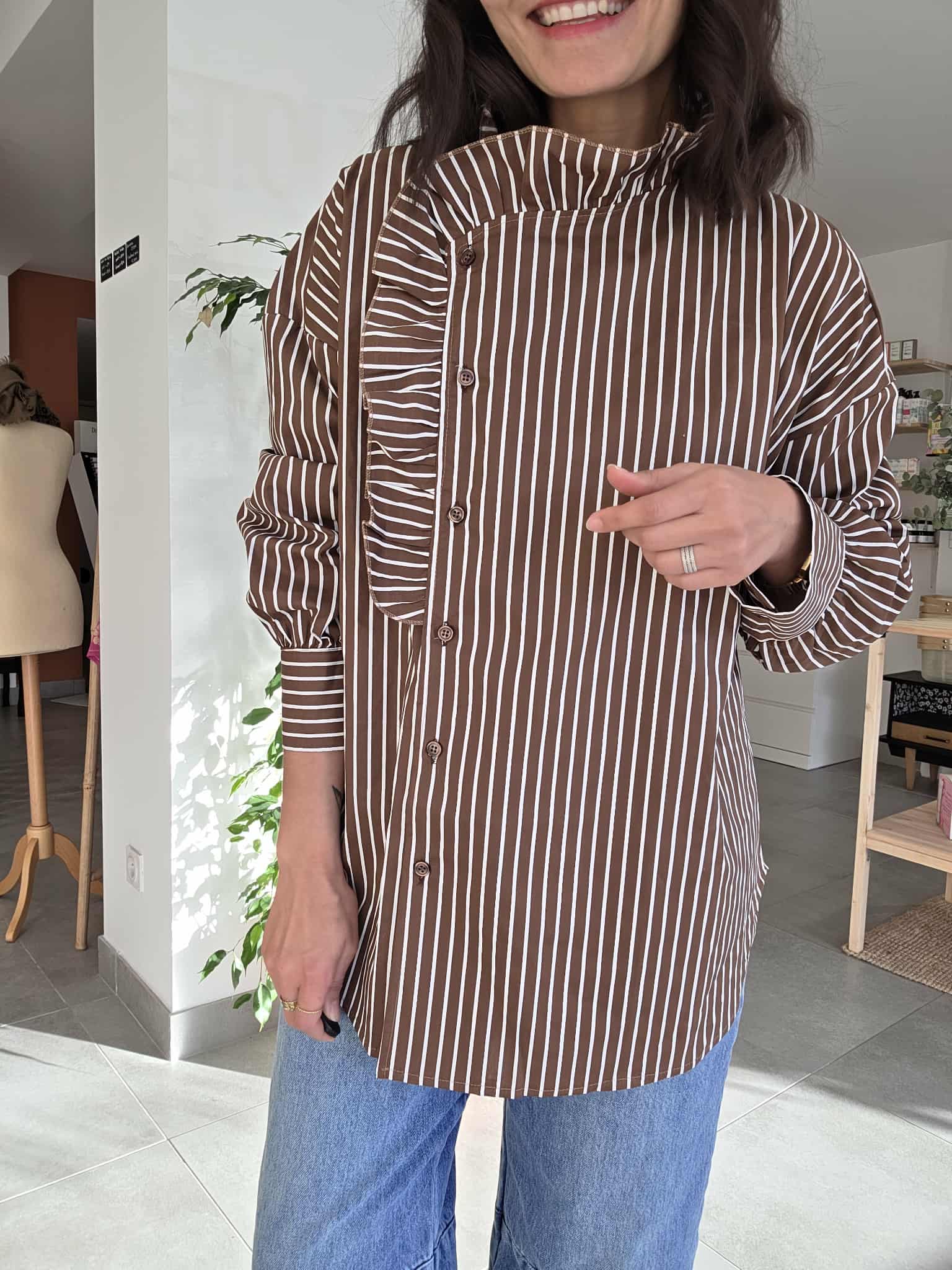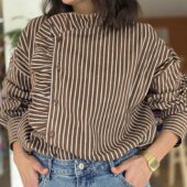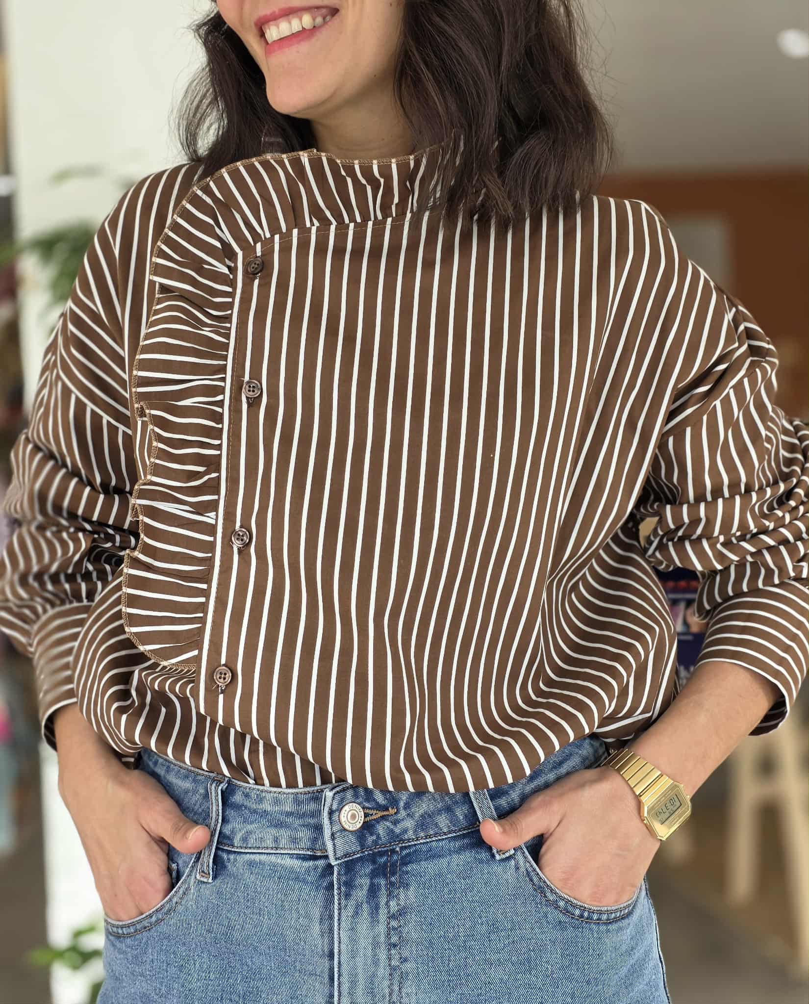 La chemise Sélène revisite les codes du chic italien. Son col montant et son jabot asymétrique apportent du caractère et un charme fou à cette pièce. Facile à associer avec un jean, un pantalon habillé ou une jupe droite, elle offre une allure féminine et affirmée.
