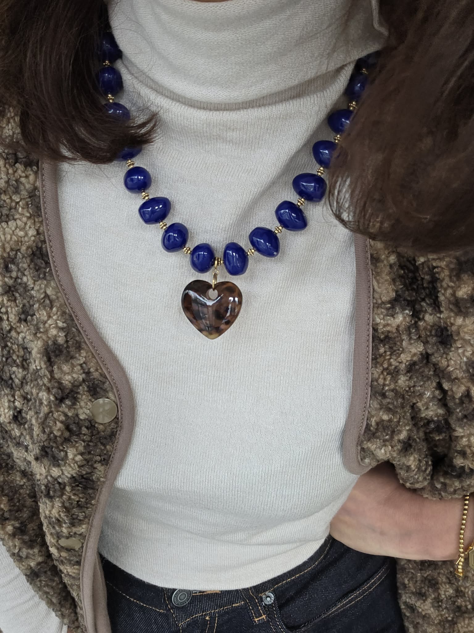 Collier sur câble composé de grosses perles en résine colorée et d’un pendentif coeur en résine.