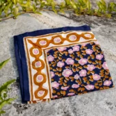 Le foulard Petit Indispensable Flower Seventies en couleur marine de chez Love Explorers allie style rétro et savoir-faire artisanal. Réalisé en 100% coton avec la technique indienne du block print, chaque pièce est unique. Ses motifs fleuris aux teintes chaudes et ses bordures graphiques évoquent l’esprit seventies. Petit et polyvalent, il se porte aussi bien autour du cou, dans les cheveux, au poignée ou encore en accessoire de sac.