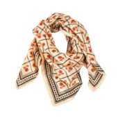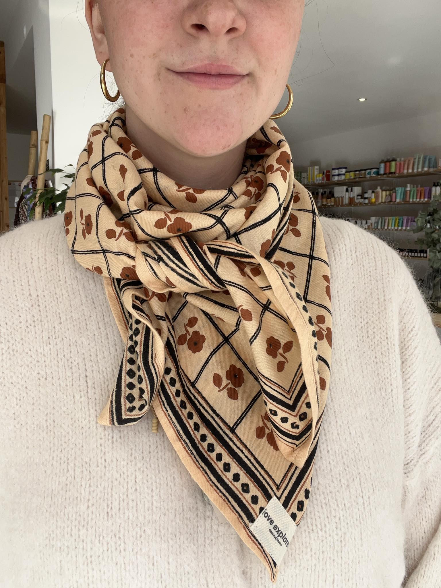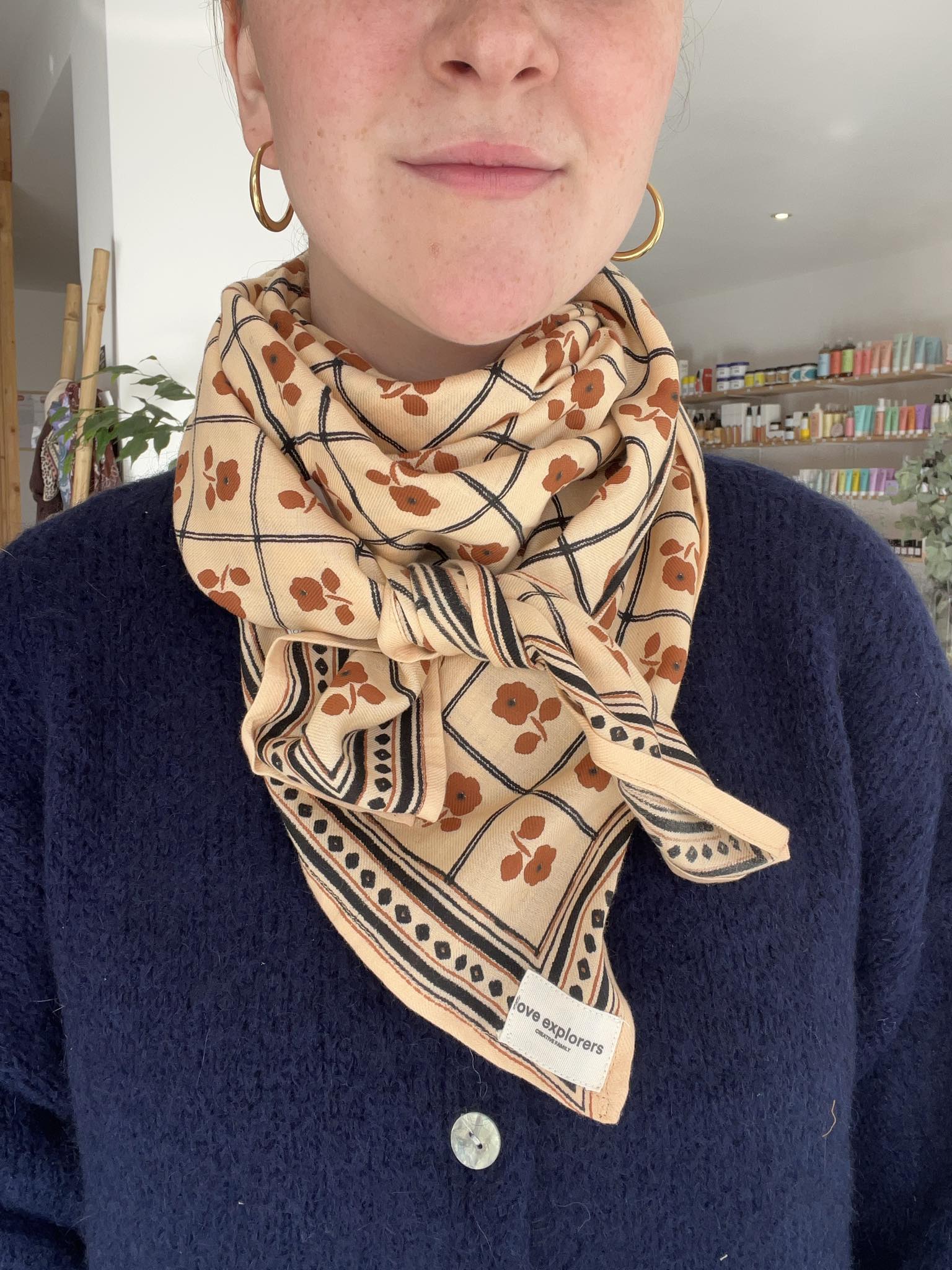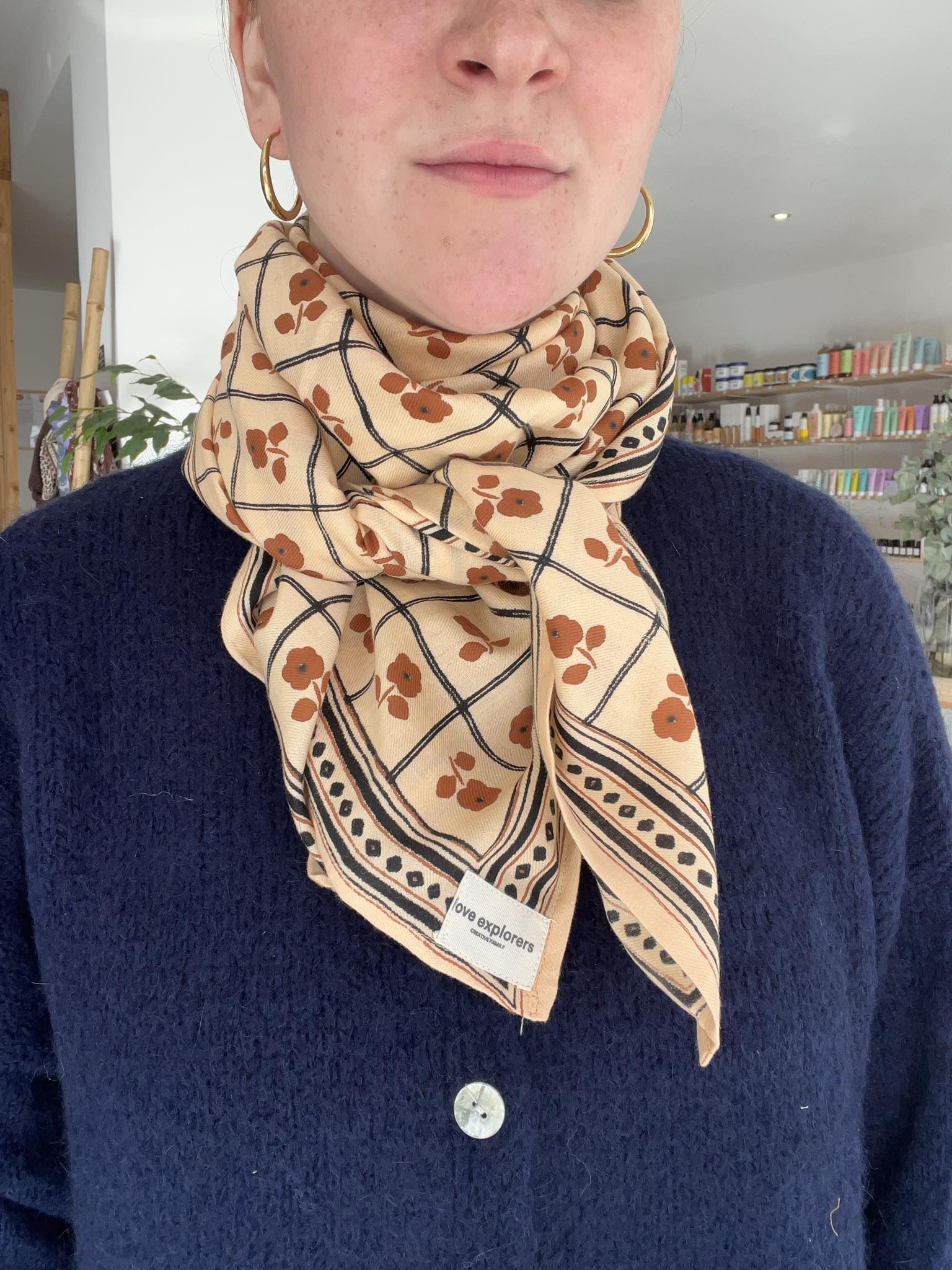 Foulard à motif floral terracotta sur fond beige, souligné de lignes graphiques contrastées. Un accessoire élégant, doux et polyvalent, idéal pour sublimer toutes vos tenues.