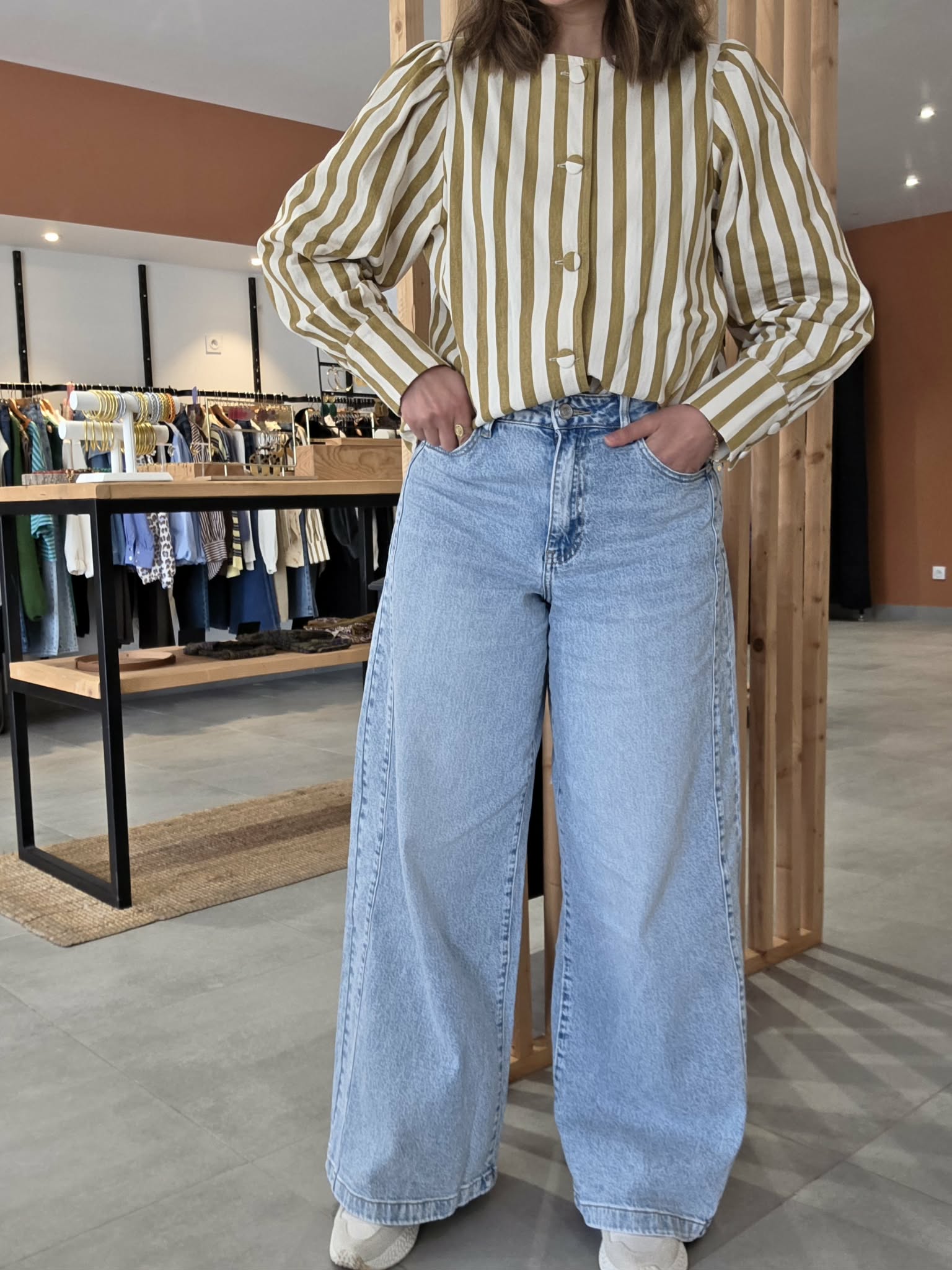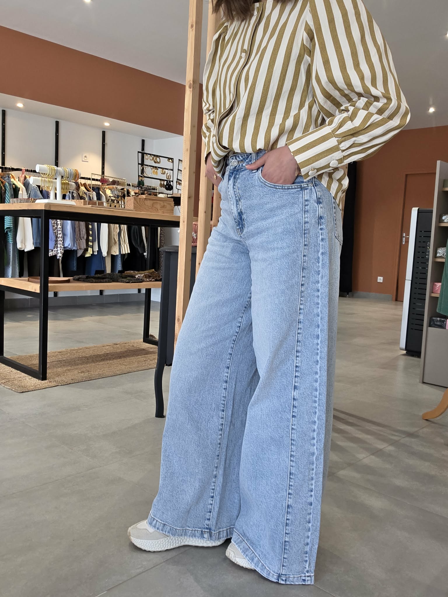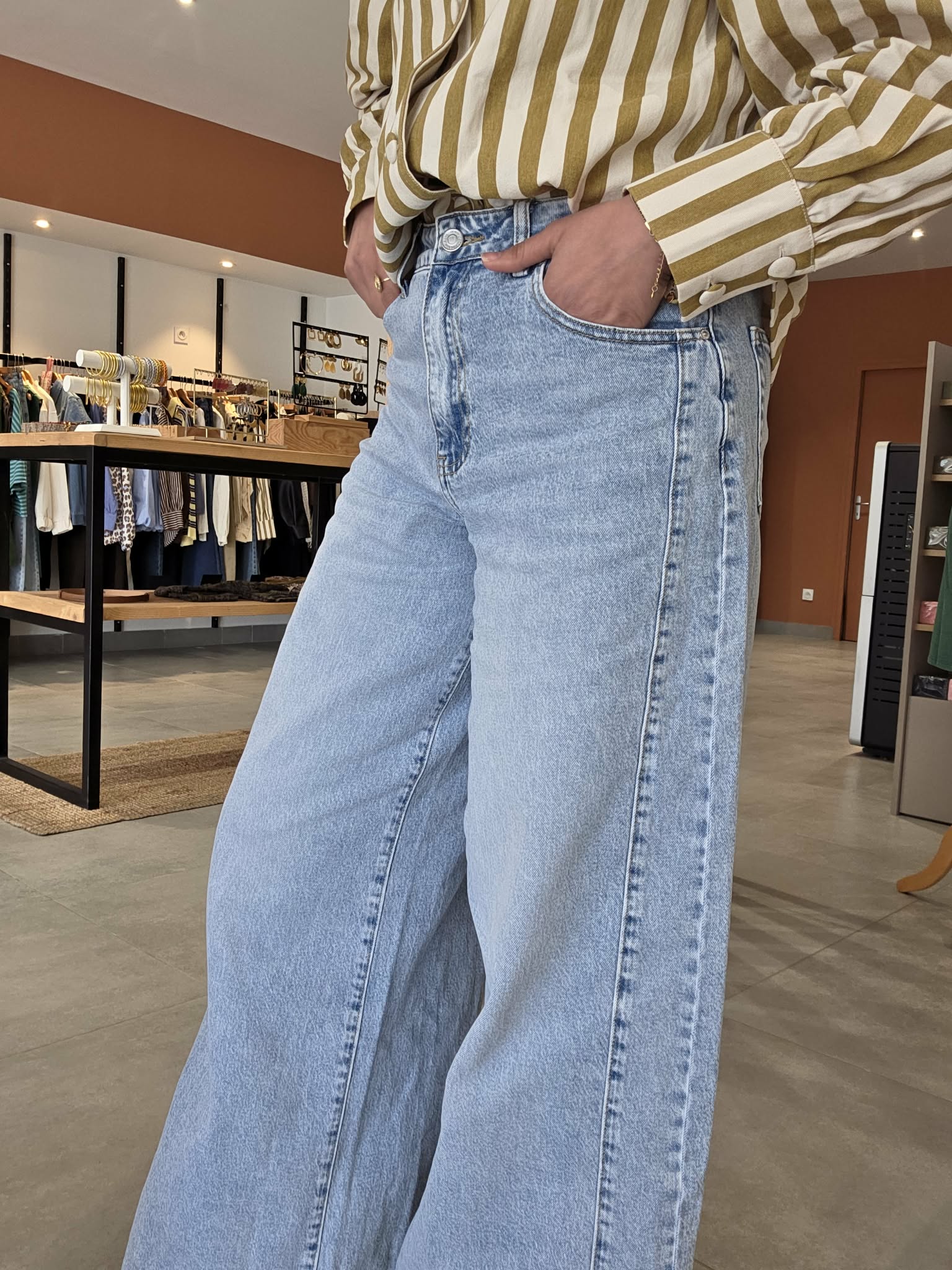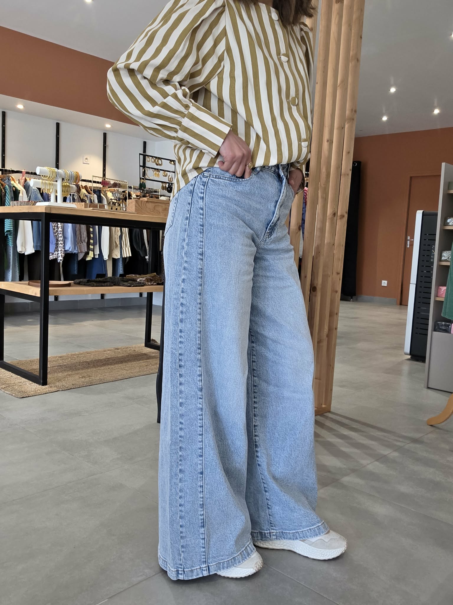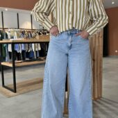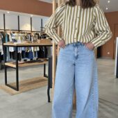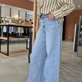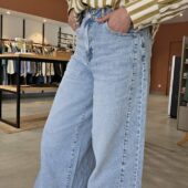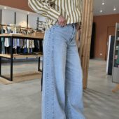 Jean en denim bleu très clair, à taille haute et coupe très large sur toute la jambe. Il se distingue par son volume ample, son esprit wide leg très mode et son empiècement couture visible sur le côté qui lui donne un joli relief. Une pièce tendance, confortable et facile à porter avec une blouse, un top ajusté ou une maille légère.