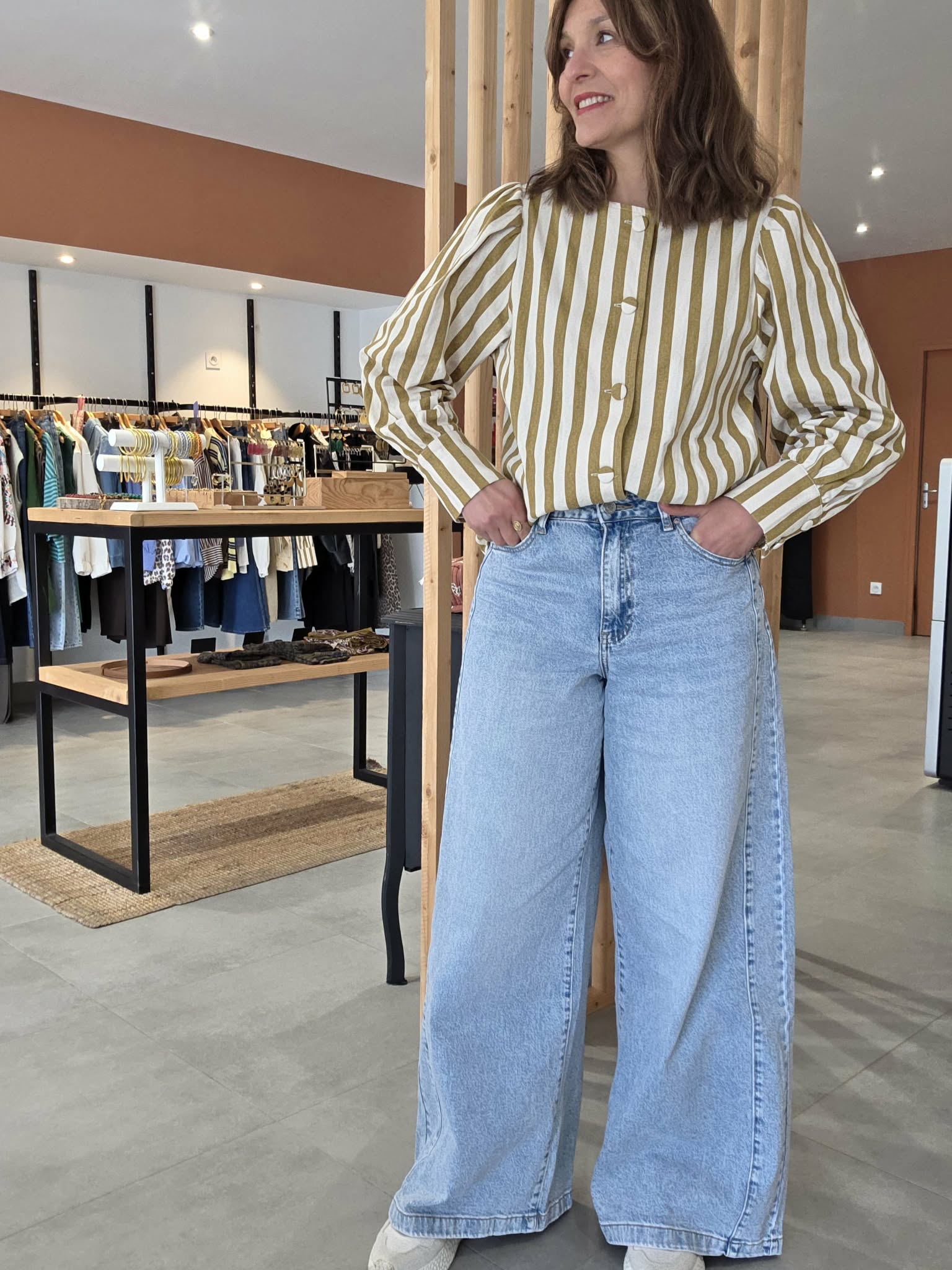 Sandrina porte la taille 38, sa taille habituelle, et mesure 1m67.