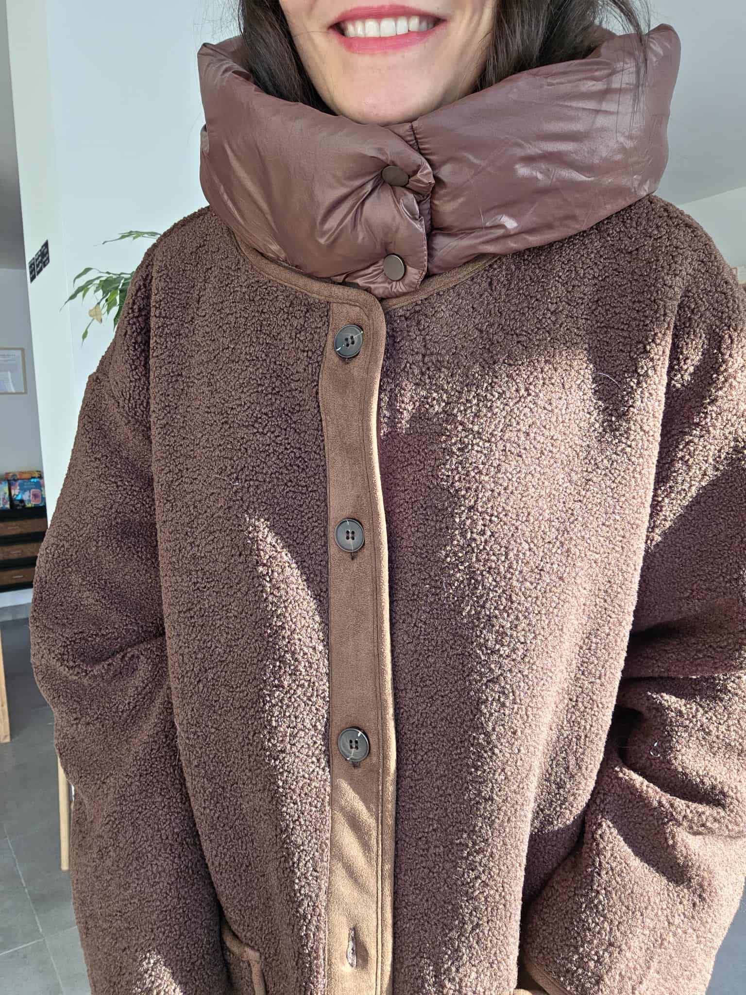 Composition : 100 % Polyester Coloris : Marron chocolat Détails : Boutons pression, capuche amovible, doublure satinée.