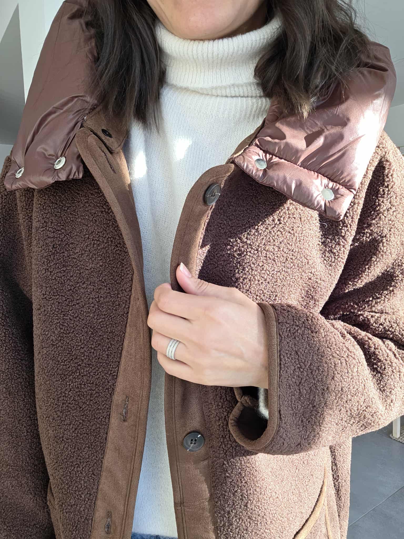 On aime : Son look cocoon chic, parfait pour la saison froide Sa capuche amovible pour varier les styles Sa douceur et sa coupe ample, confortable et élégante à la fois
