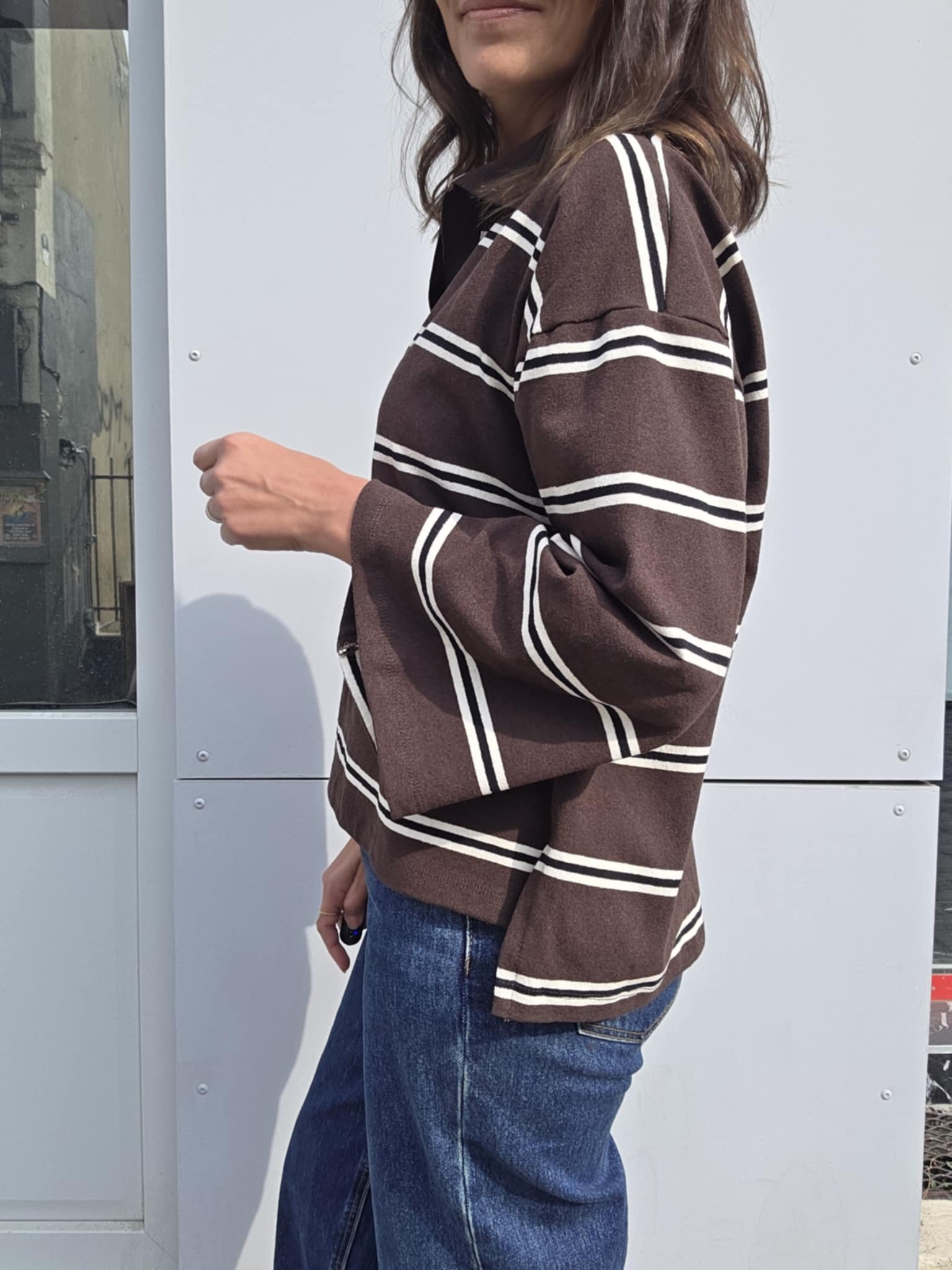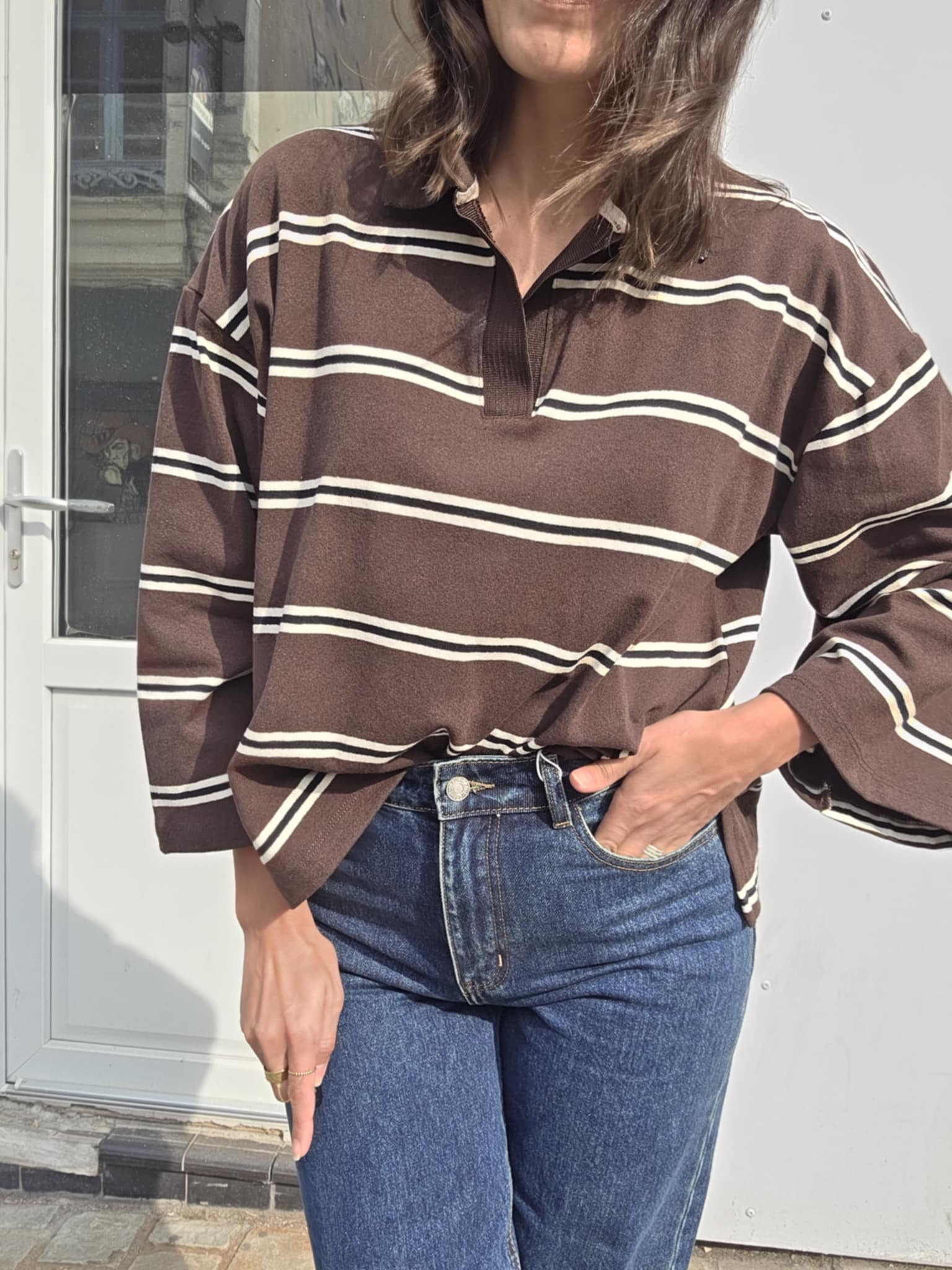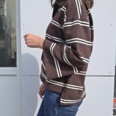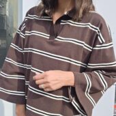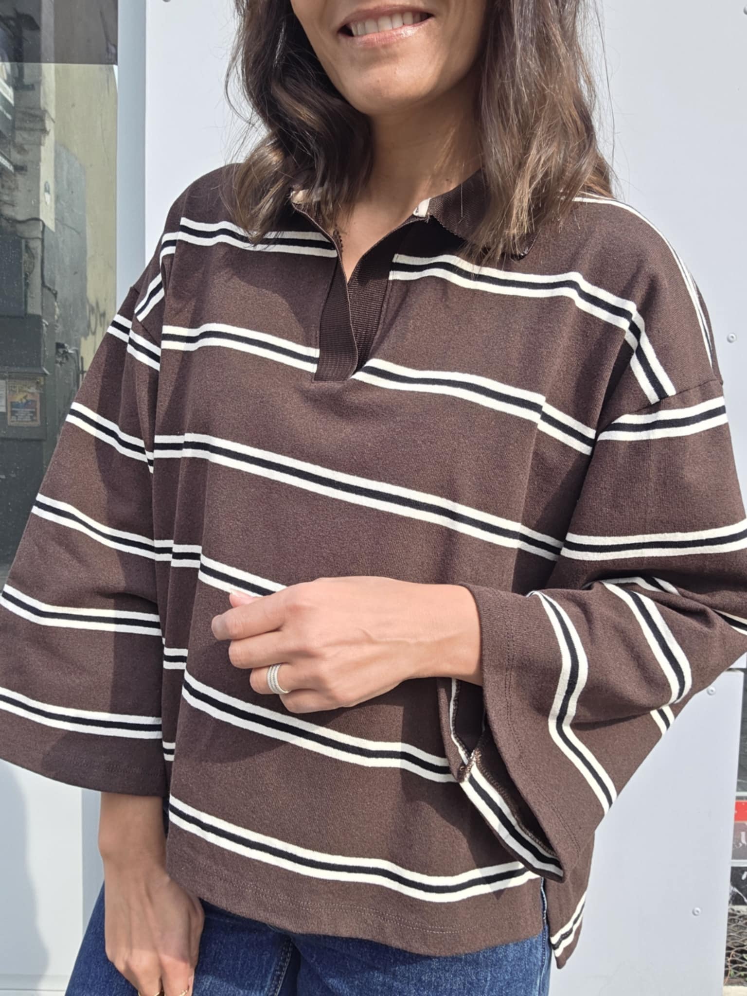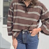 Un polo chocolat à rayures blanc, revisité avec des manches ballon et une coupe loose.