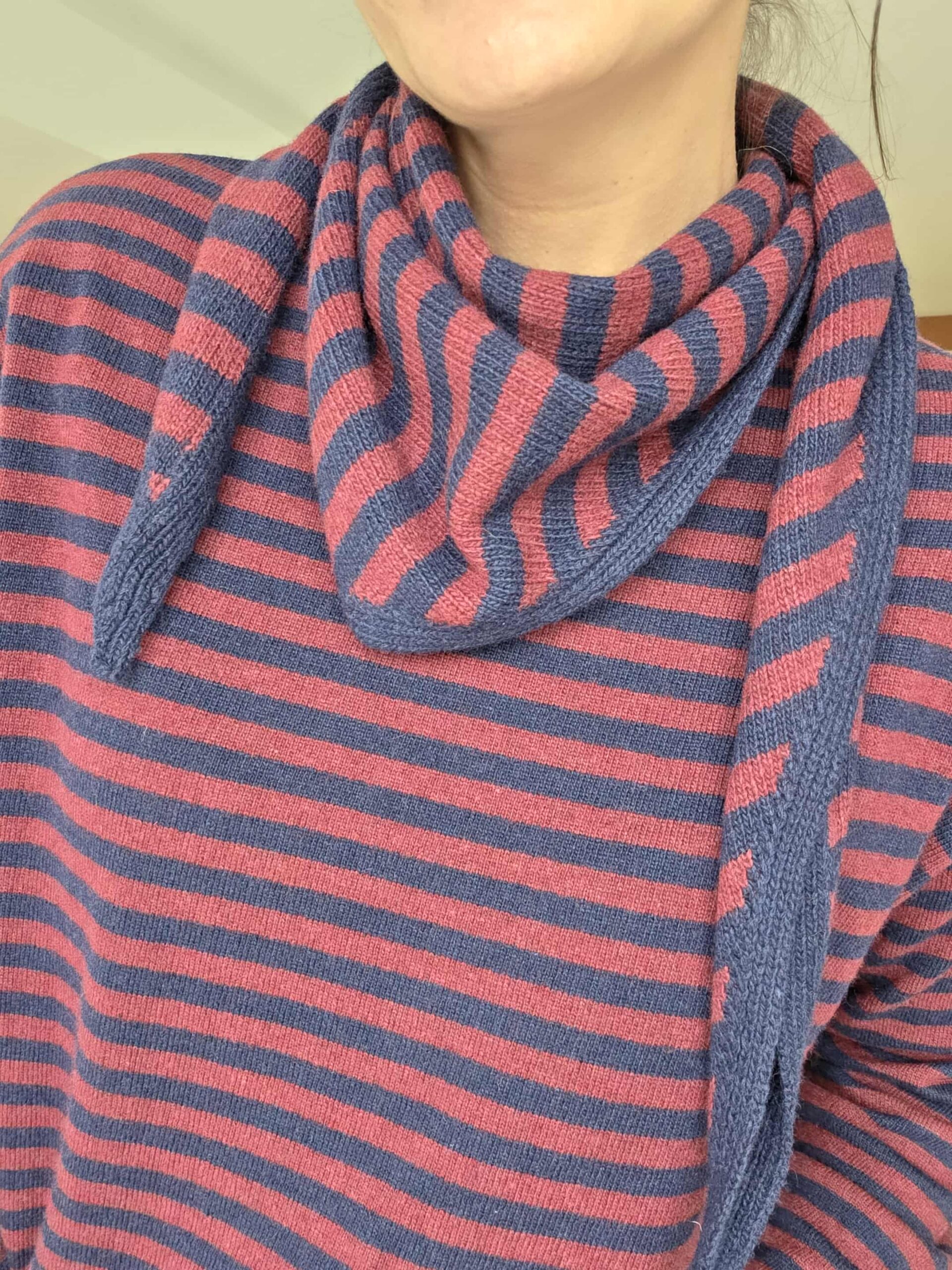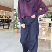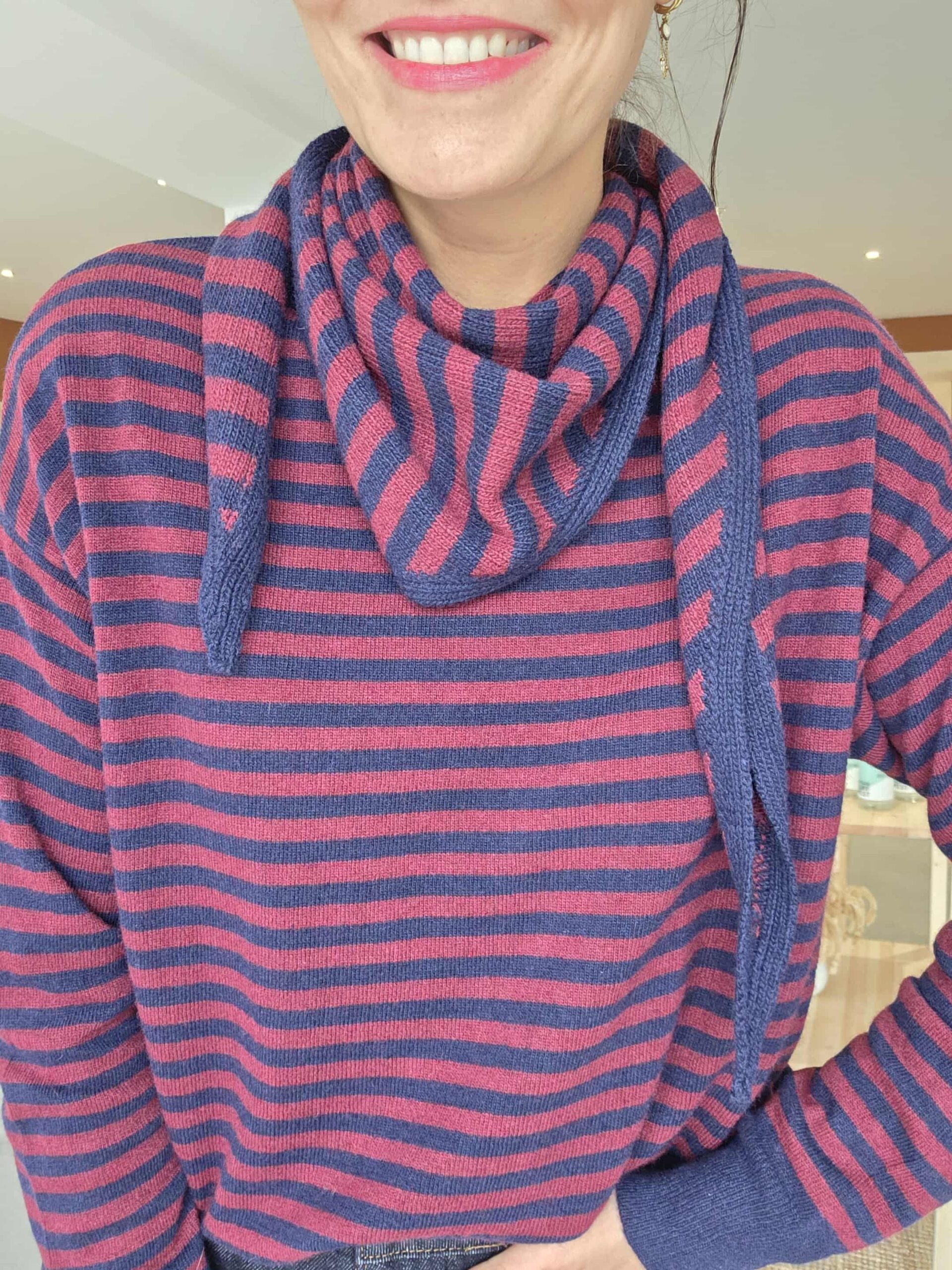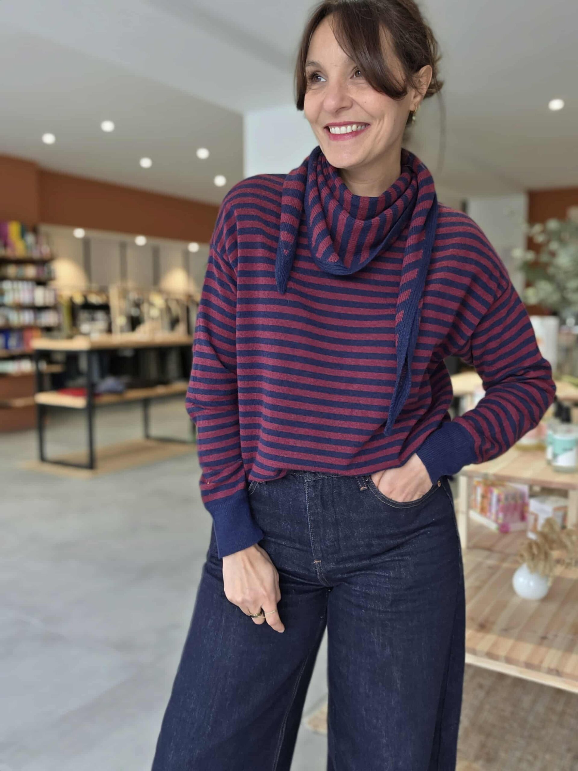 Maille douce et confortable, coupe facile à vivre. Parfait avec un jean ou une jupe ; s’accorde avec le foulard Louison. Les rayures sont de couleurs bordeaux et bleues marines.