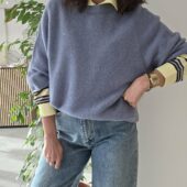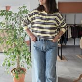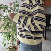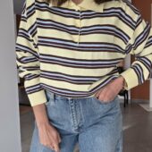 Pull à rayures bleues, marrons et jaunes, lumineux et ultra doux, parfait pour apporter une touche de fraîcheur à vos tenues de printemps. Sa maille souple et agréable se porte facilement au quotidien, aussi bien avec un jean qu’un pantalon plus habillé.