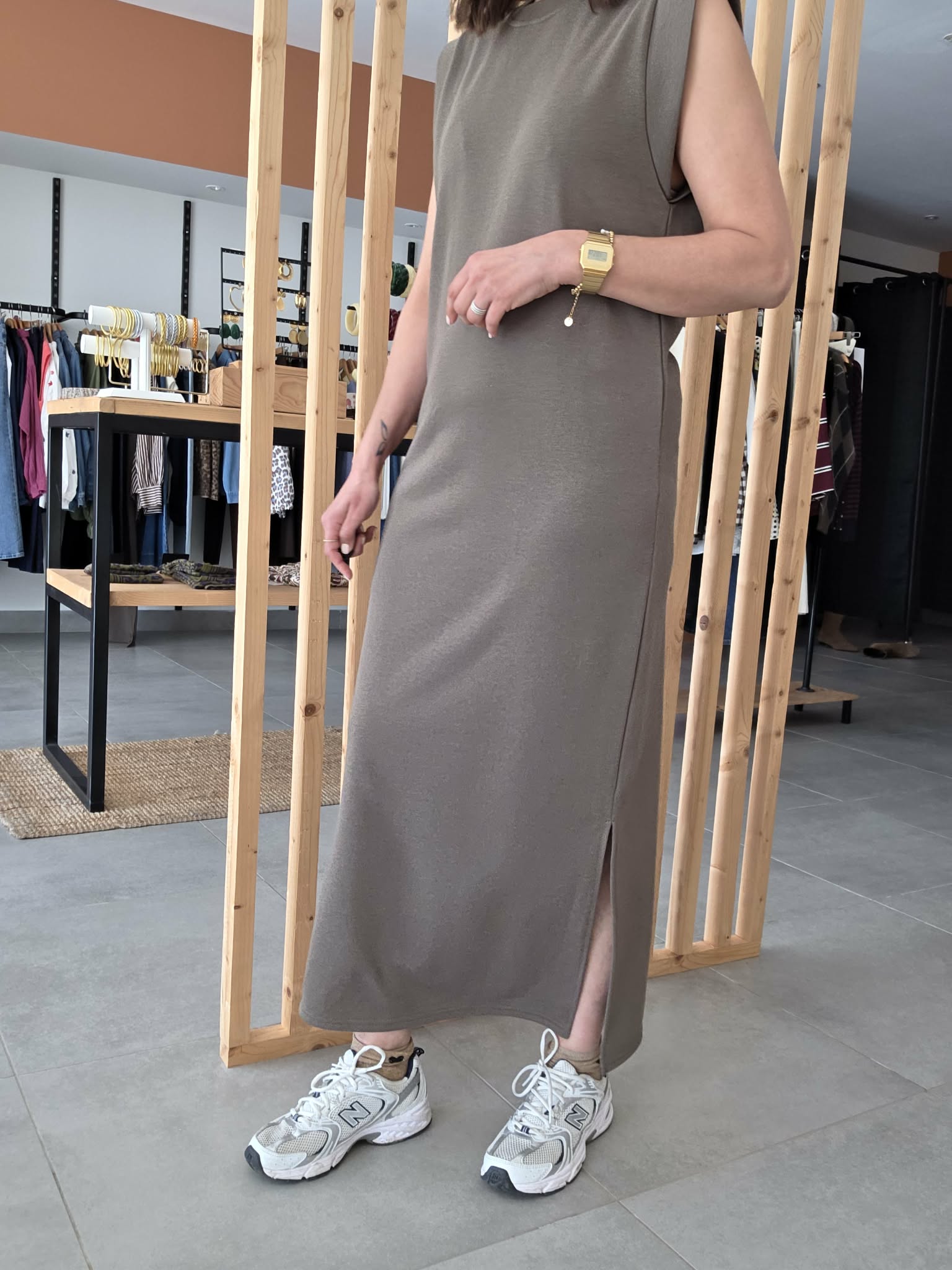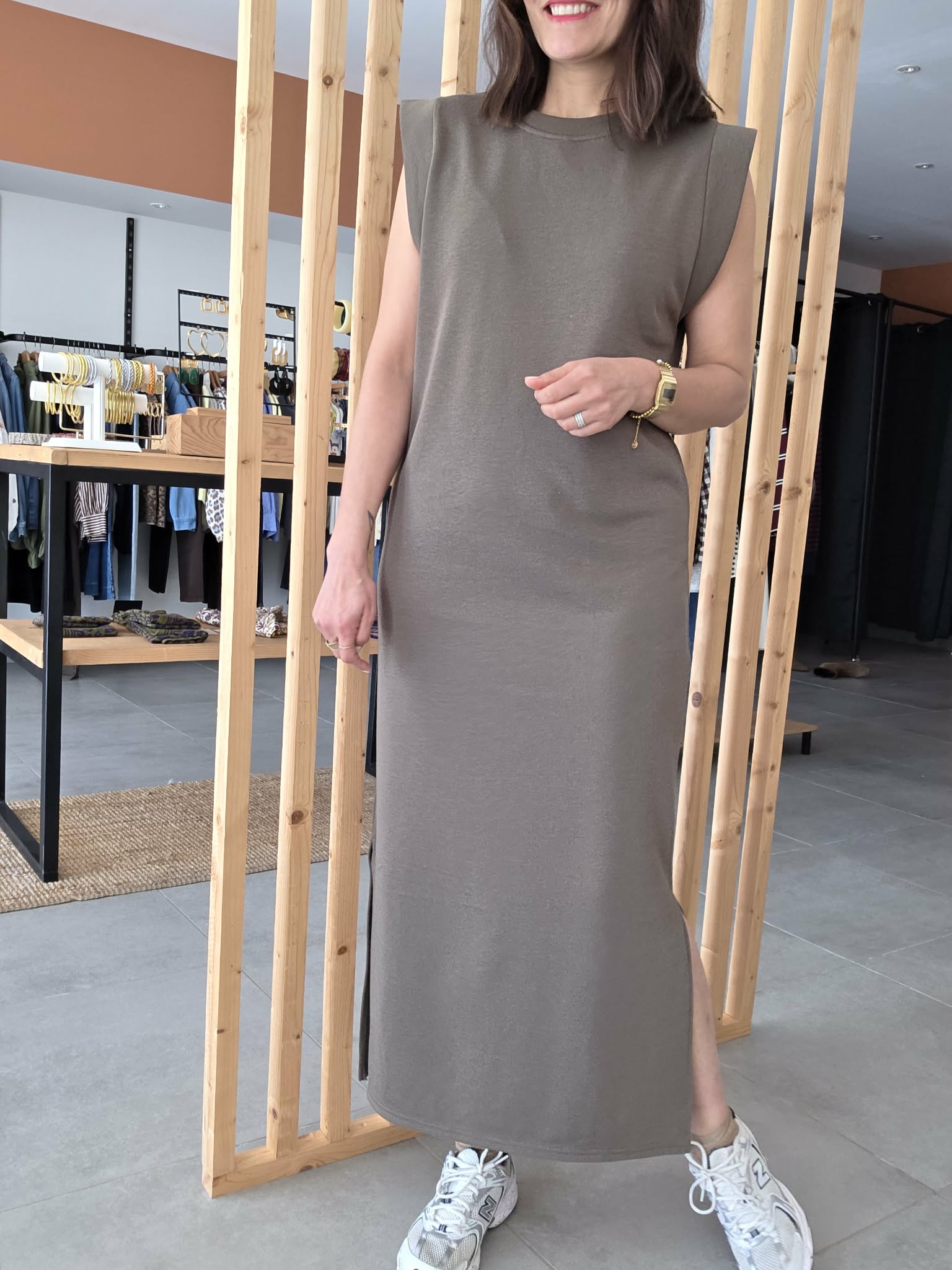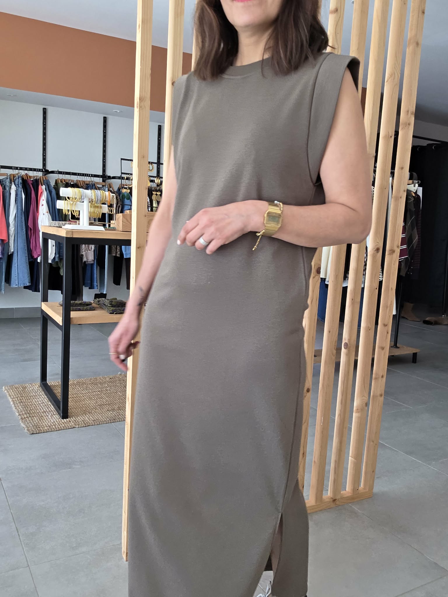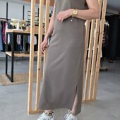 Sa ligne fluide épouse le corps sans le mouler, offrant un tombé naturel et confortable. La fente discrète sur le côté permet une liberté de mouvement et ajoute une touche féminine à l’ensemble.