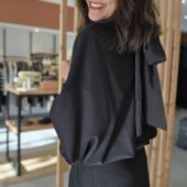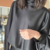 Une robe satinée noire, manches forme chauve souris, col montant et son noeud dans le dos.