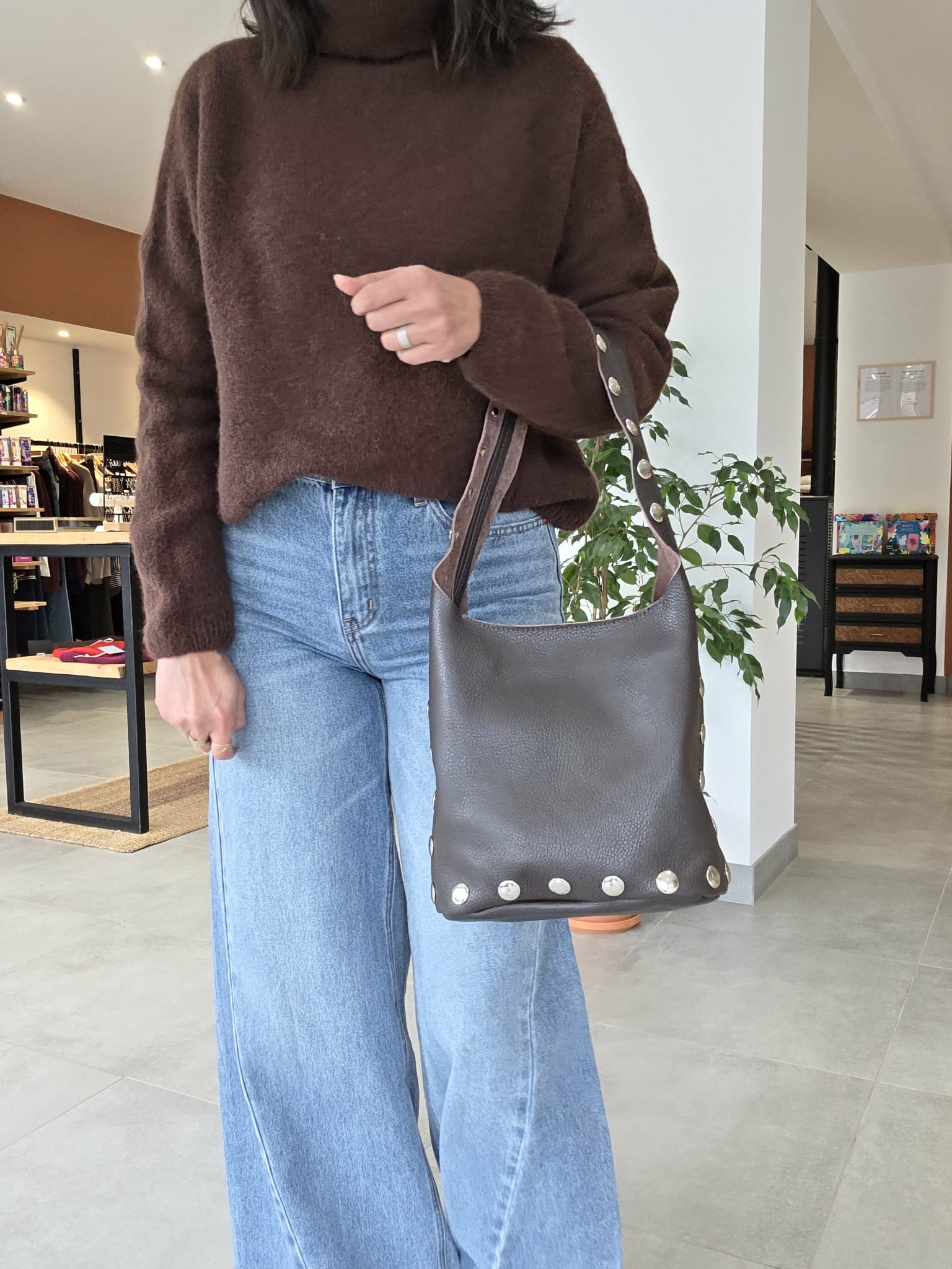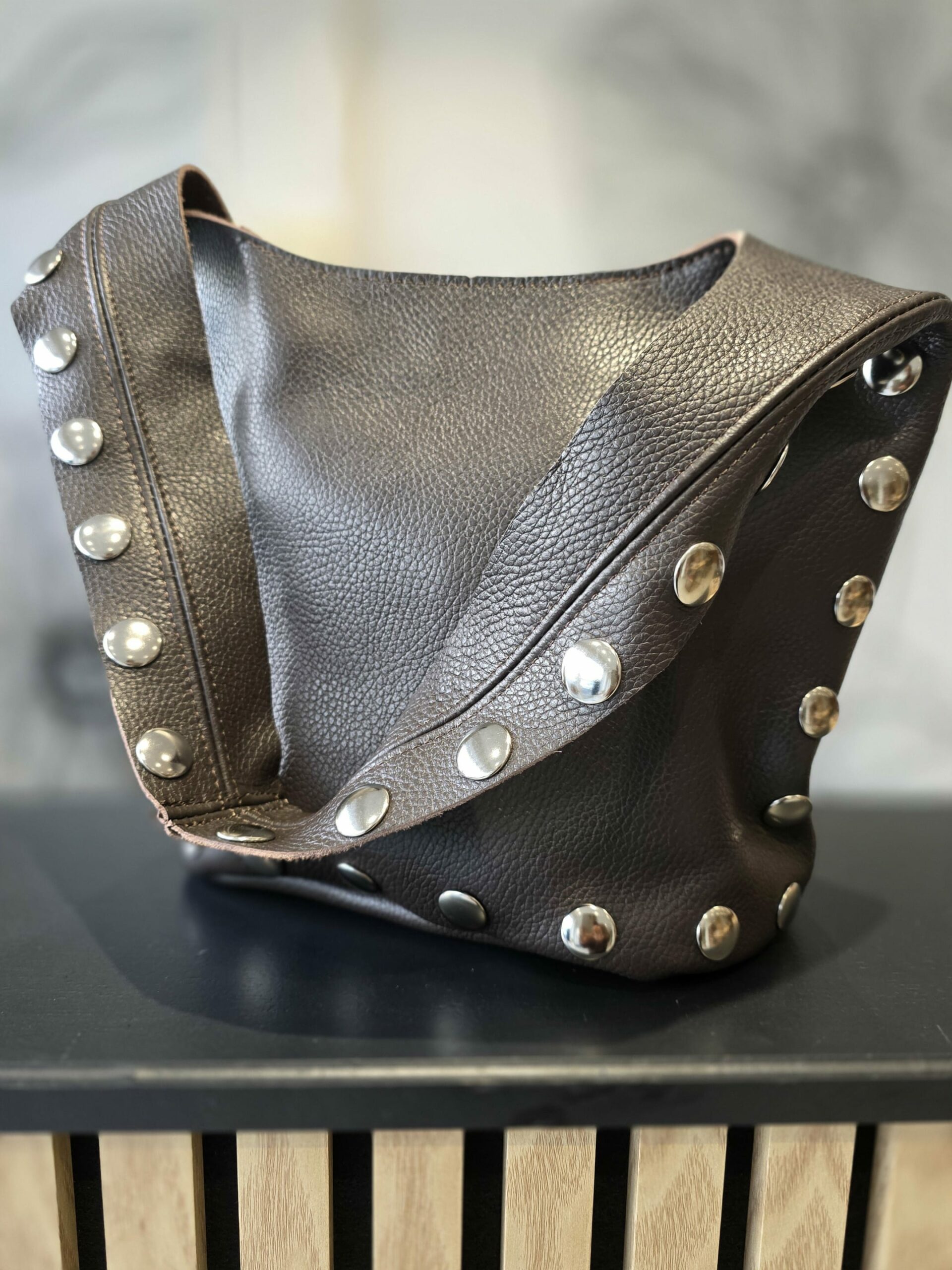 Découvrez ce sac en cuir au style moderne et affirmé. Son design souple, rehaussé de gros clous métalliques décoratifs, en fait un accessoires tendance qui apporte du caractère à toutes vos tenues. Idéal pour un usage quotidien grâce à son format pratique et sa texture résistante.