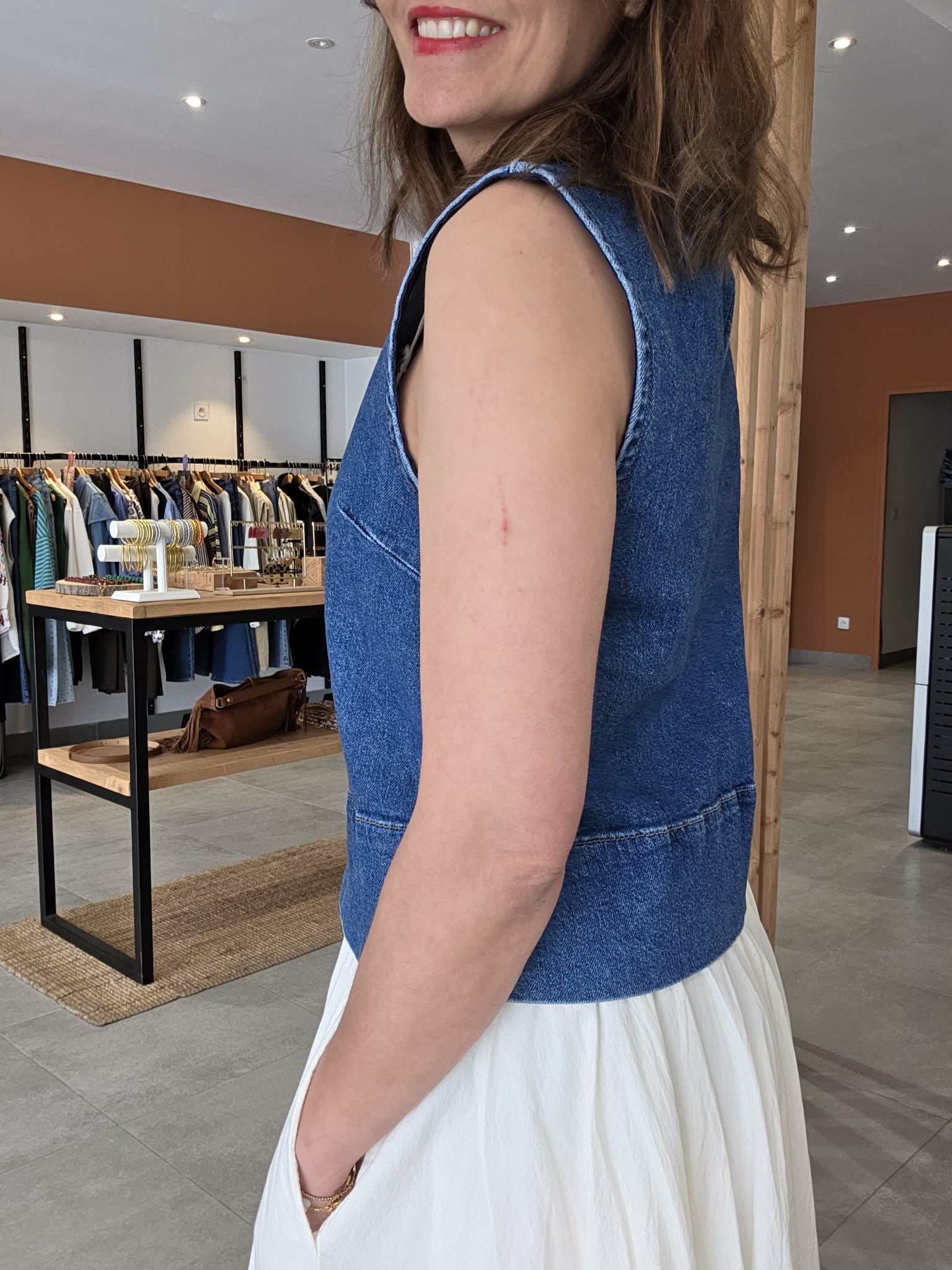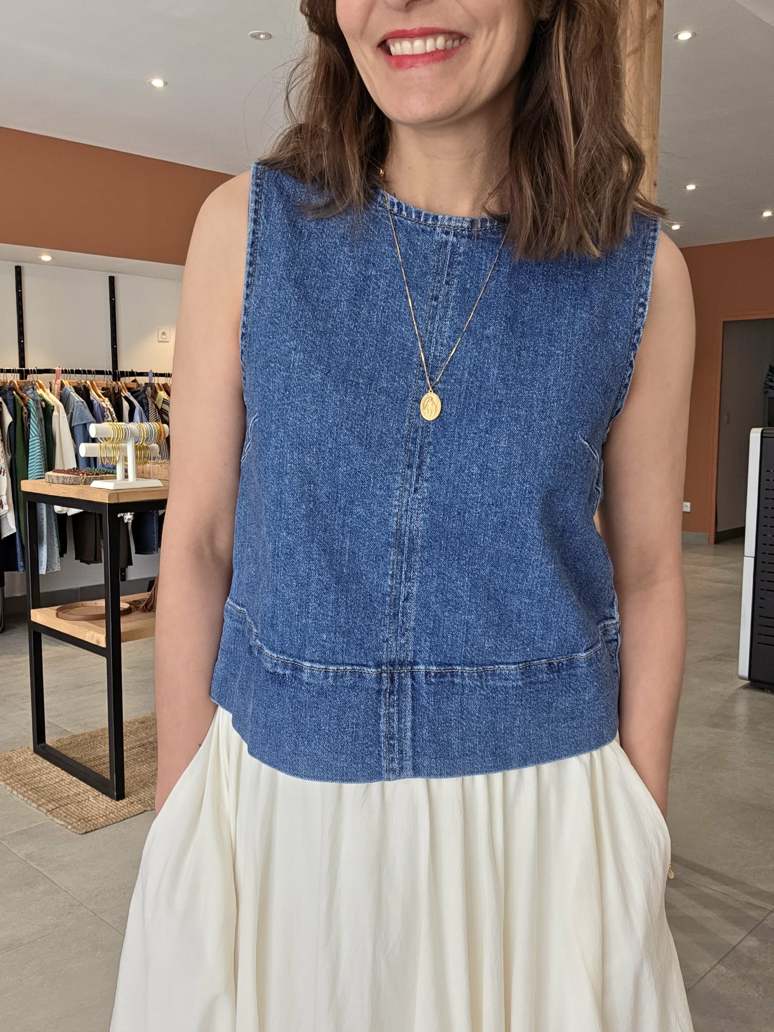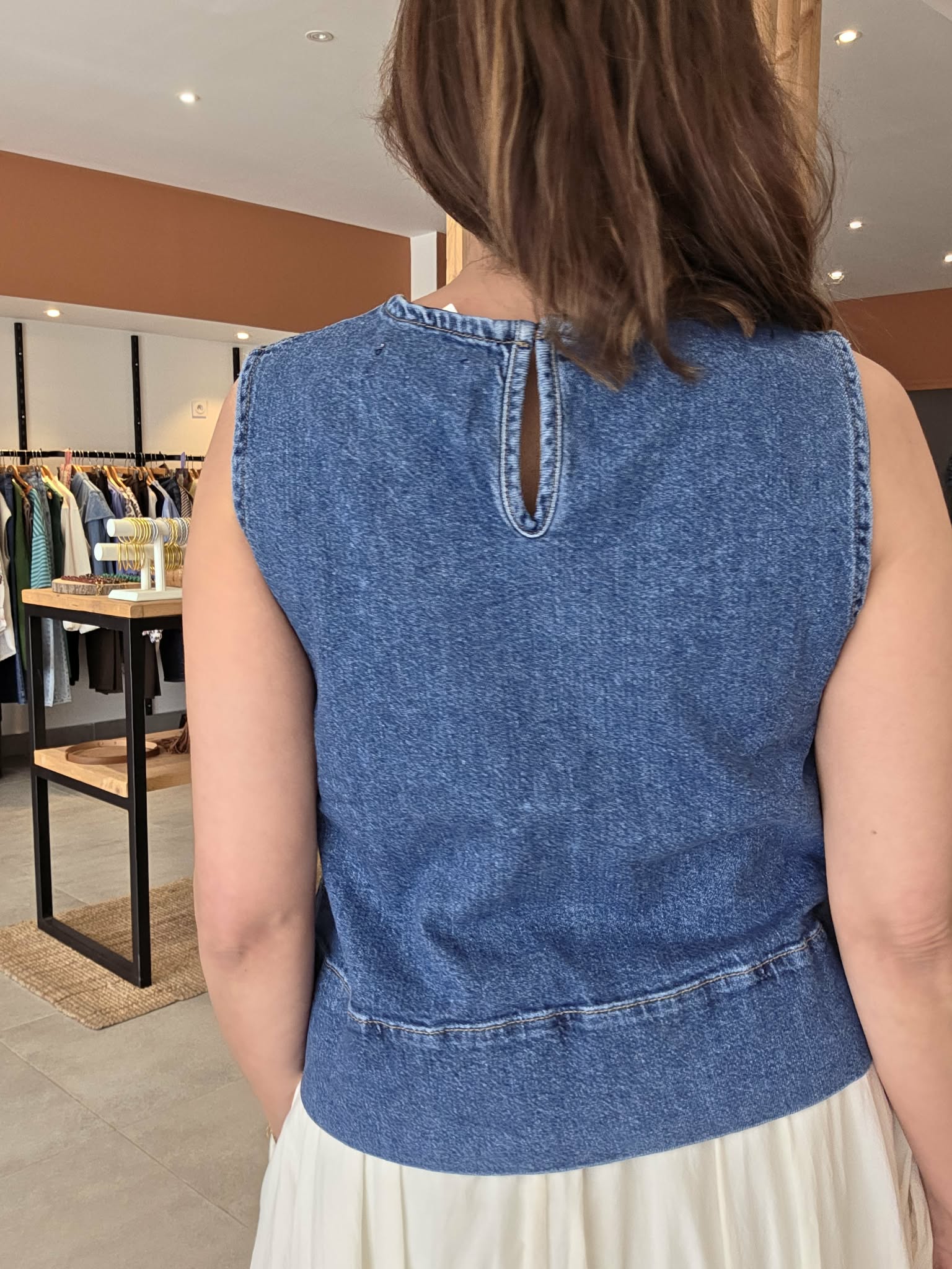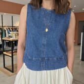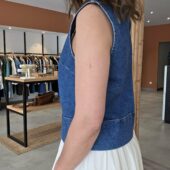 Ce top en jean sans manches est un essentiel mode facile à associer. Sa coupe sobre et moderne en fait une pièce idéale pour composer des looks tendance sans effort. Il se marie parfaitement avec une jupe blanche, un pantalon fluide, un short ou un jean pour un total look denim très actuel.