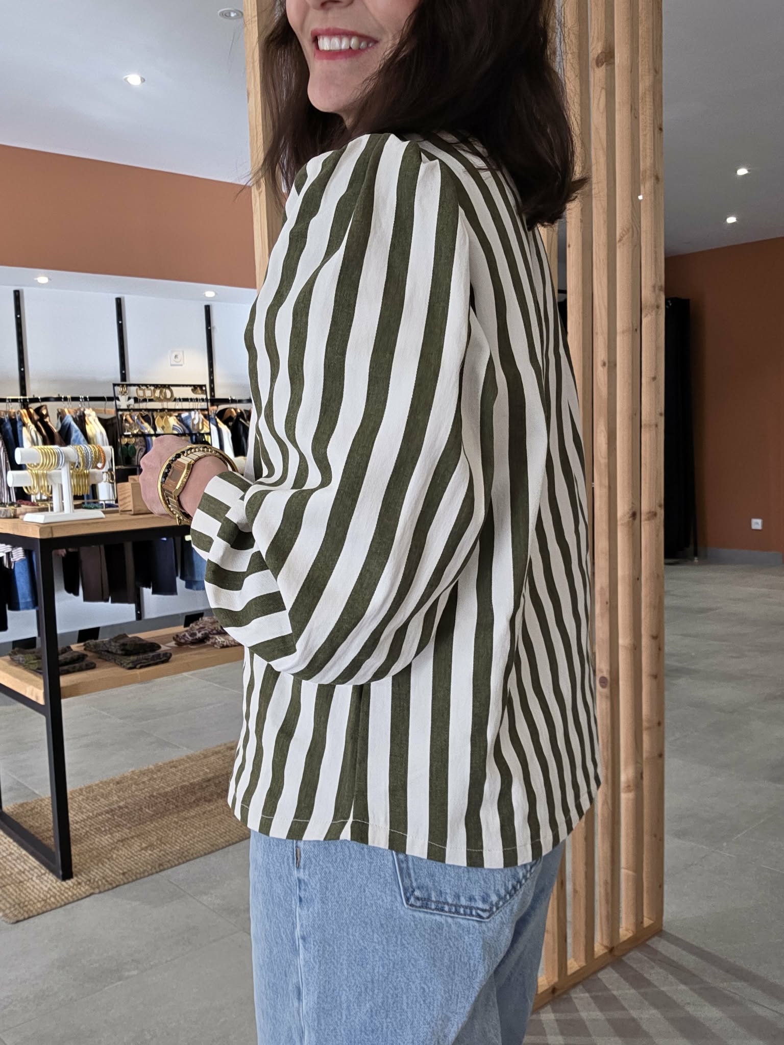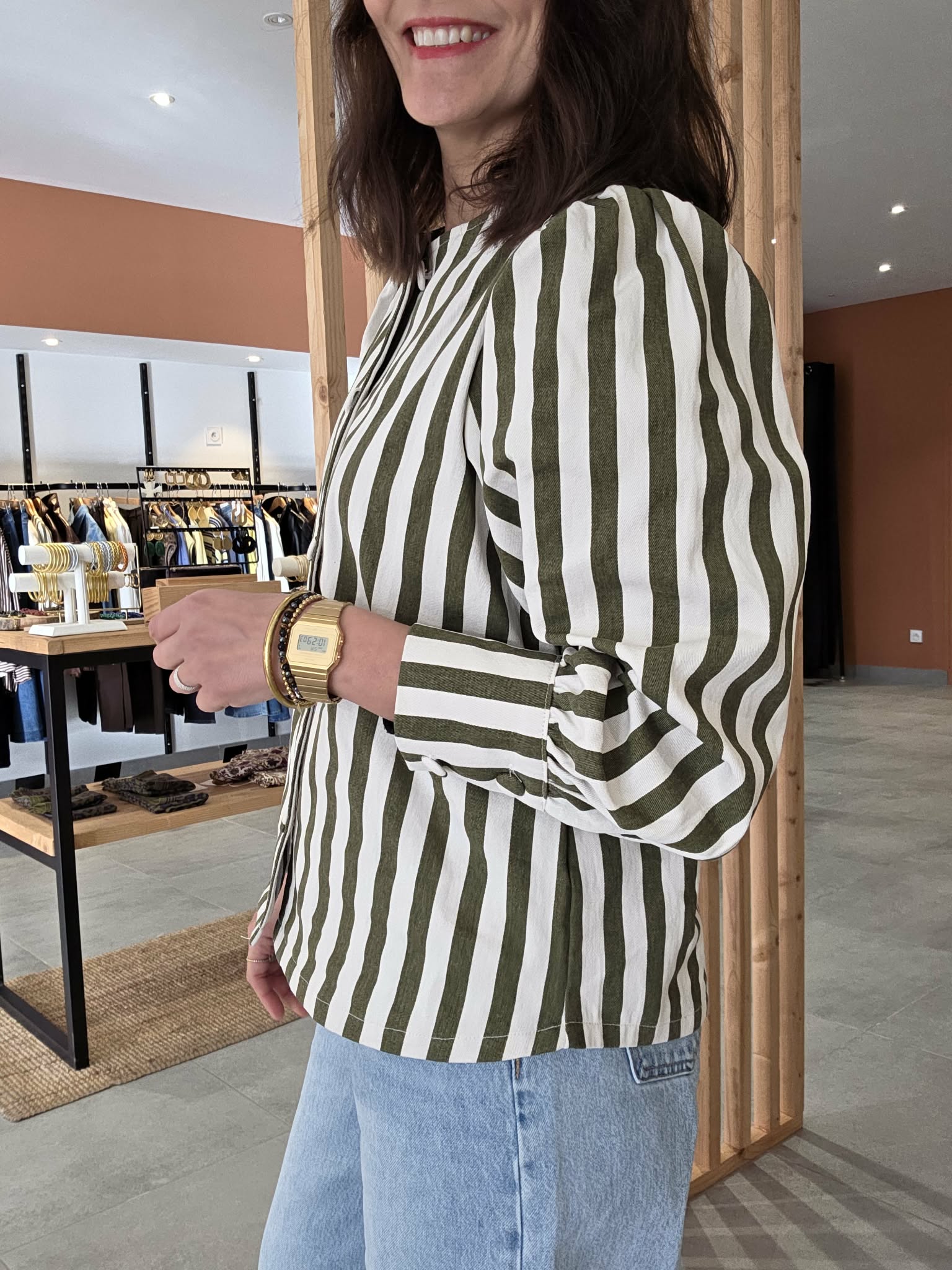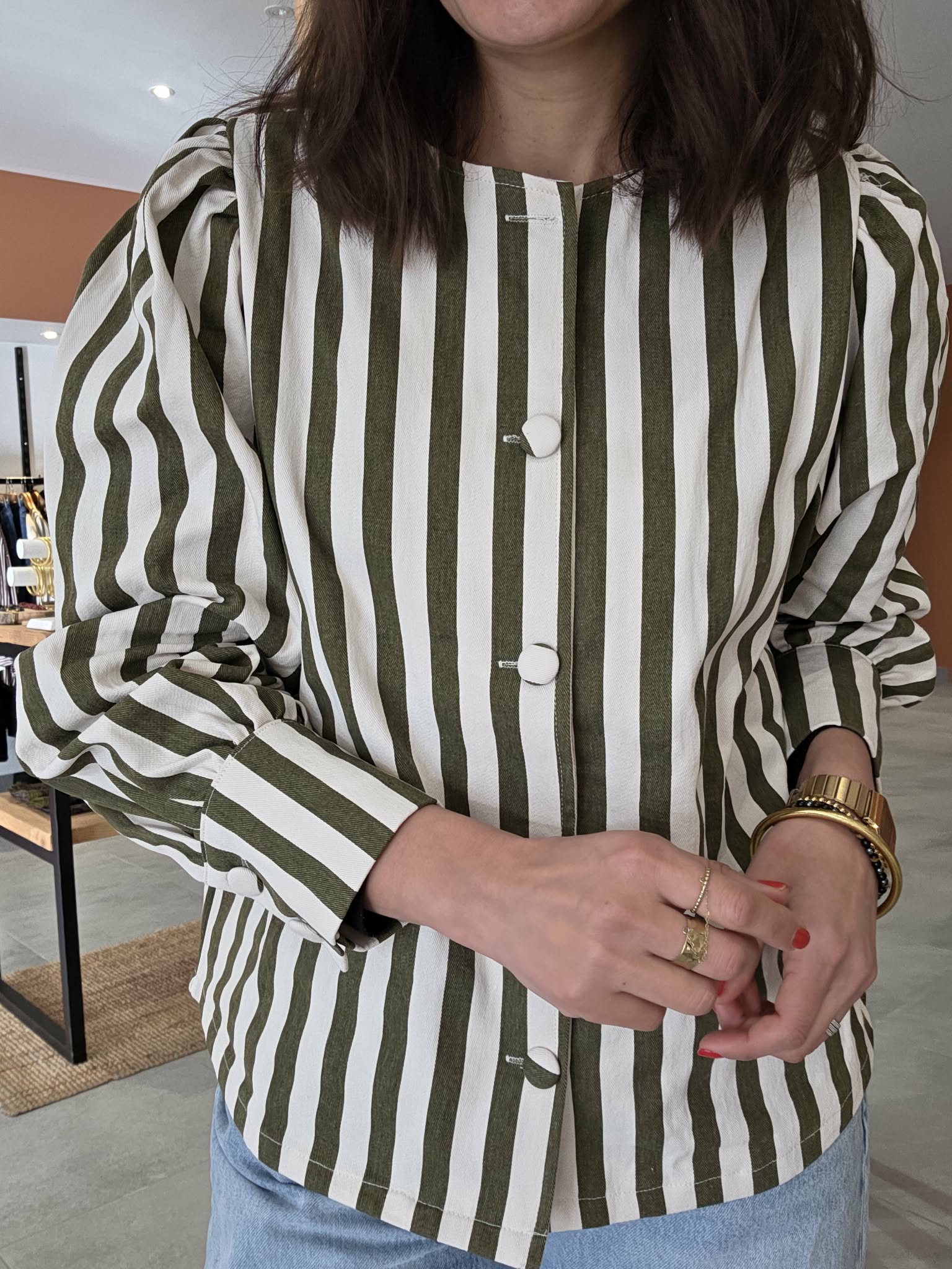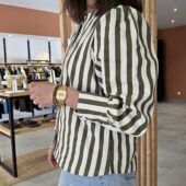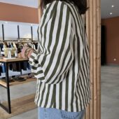 Cette veste rayée kaki et écru est la pièce parfaite pour un look à la fois élégant, moderne et facile à porter au quotidien.