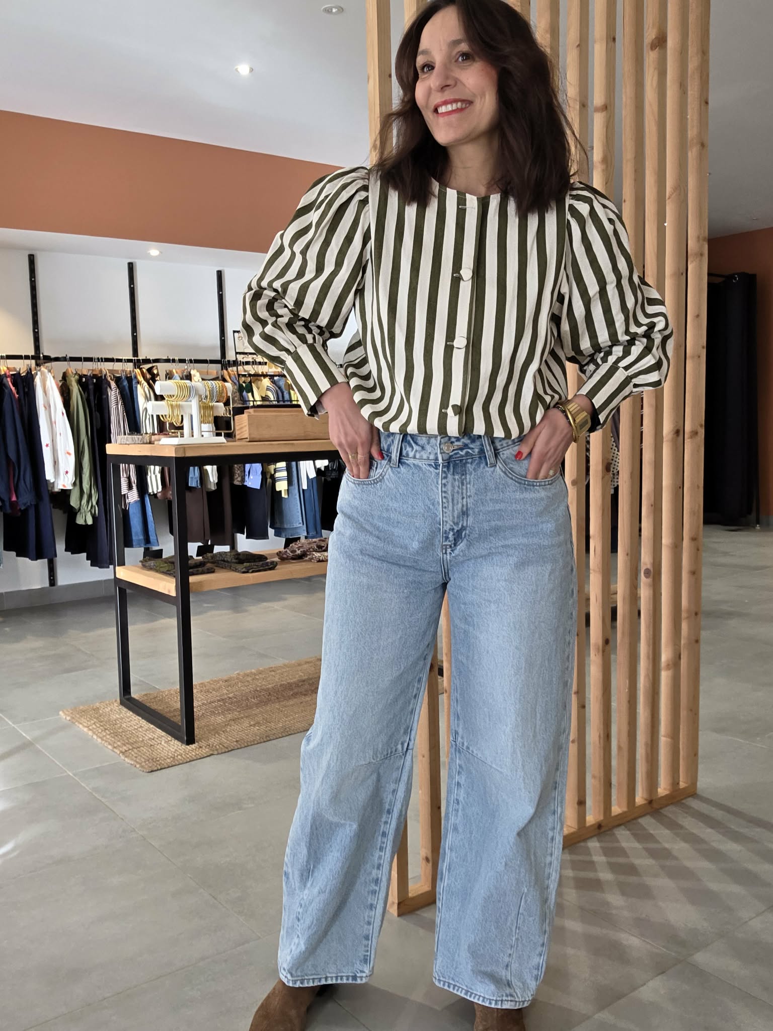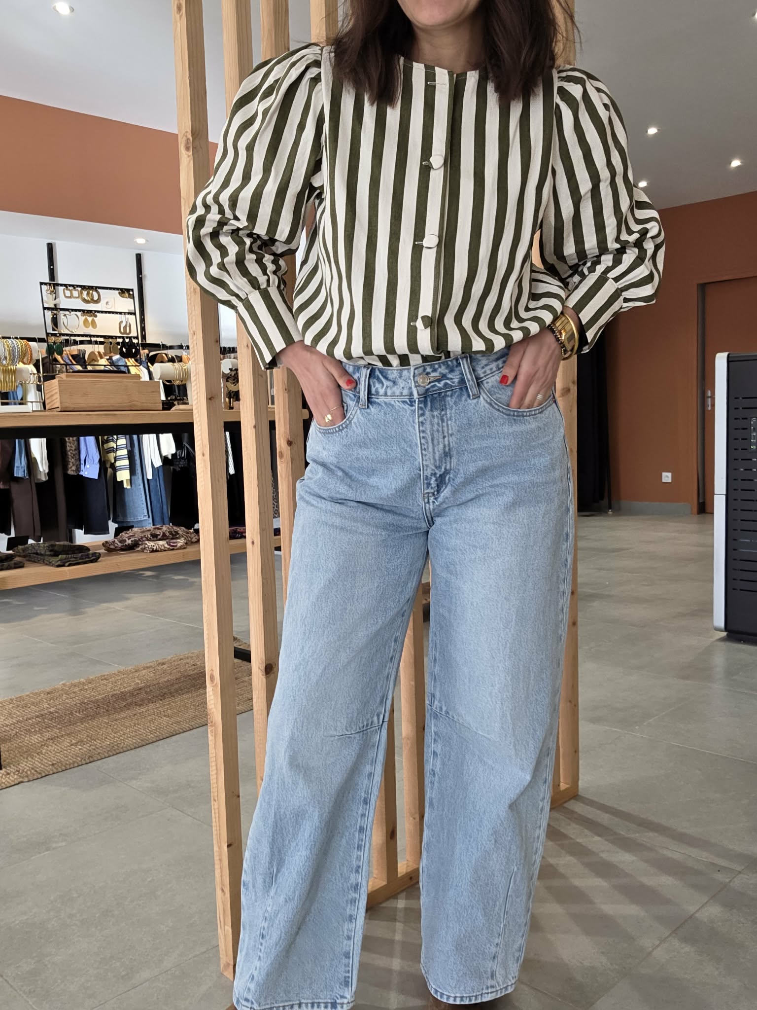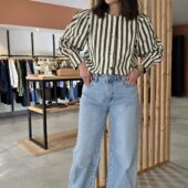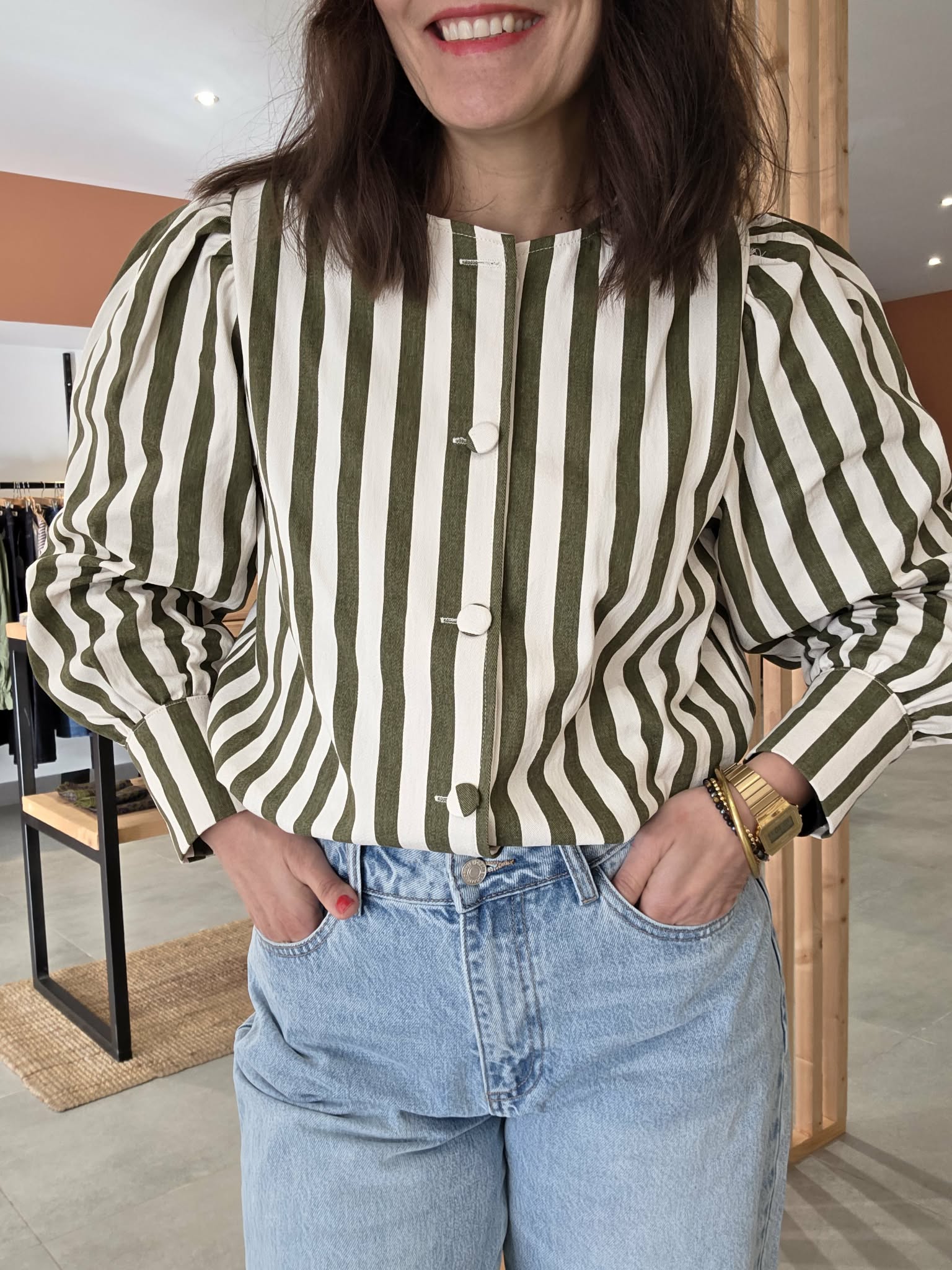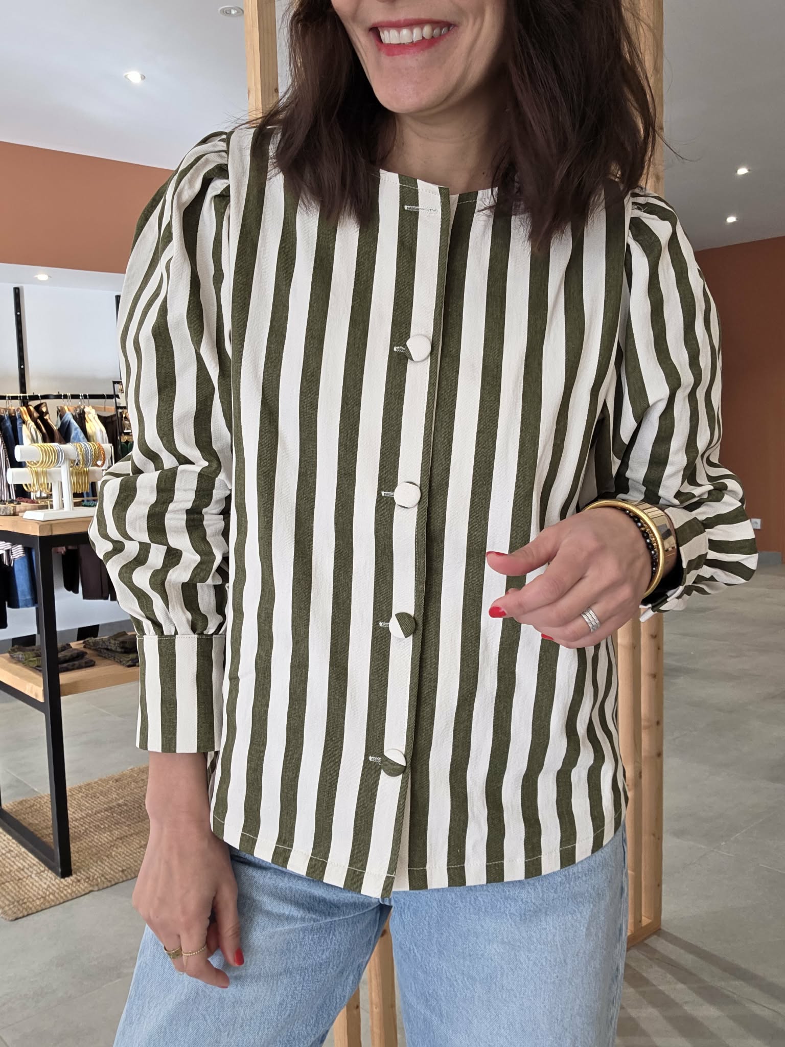 Cette veste rayée kaki et écru est la pièce parfaite pour un look à la fois élégant, moderne et facile à porter au quotidien.