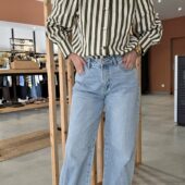 Ses rayures verticales allongent la silhouette tandis que sa coupe droite assure un tombé naturel et confortable. Les boutons recouverts apportent une touche raffinée et discrète, et les manches longues légèrement froncées structurent subtilement l’ensemble.