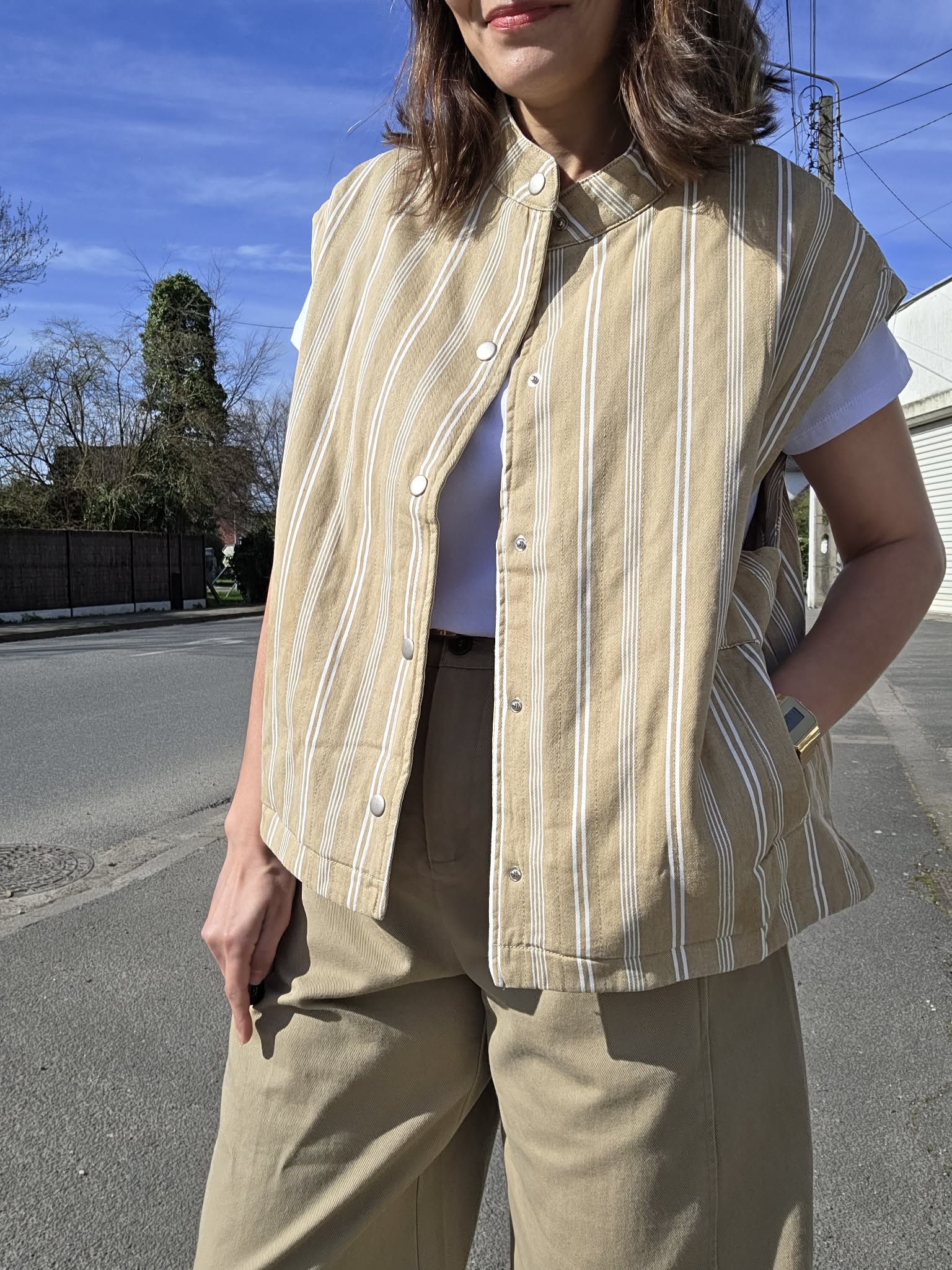 Une pièce tendance et facile à porter pour la mi-saison. Cette veste sans manches matelassée à rayures blanches et sable apporte immédiatement une touche chic et décontractée à votre tenue. Son 100 % coton assure un confort naturel et une belle tenue, tandis que sa coupe moderne permet de la superposer facilement sur un t-shirt, une blouse ou une chemise.